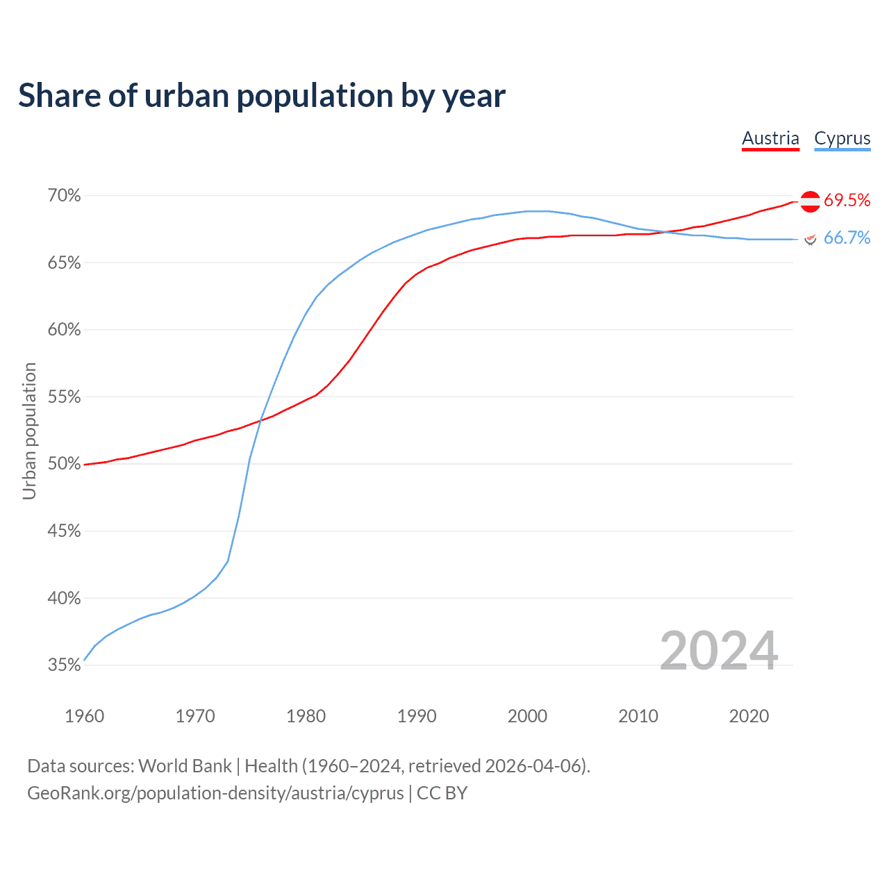 From 2004 to 2024, the share of urban population changed from 67% to 69.5% in Austria and from 68.6% to 66.7% in Cyprus.