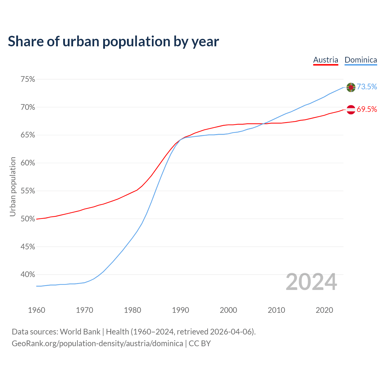 From 2004 to 2024, the share of urban population changed from 67% to 69.5% in Austria and from 66% to 73.5% in Dominica.