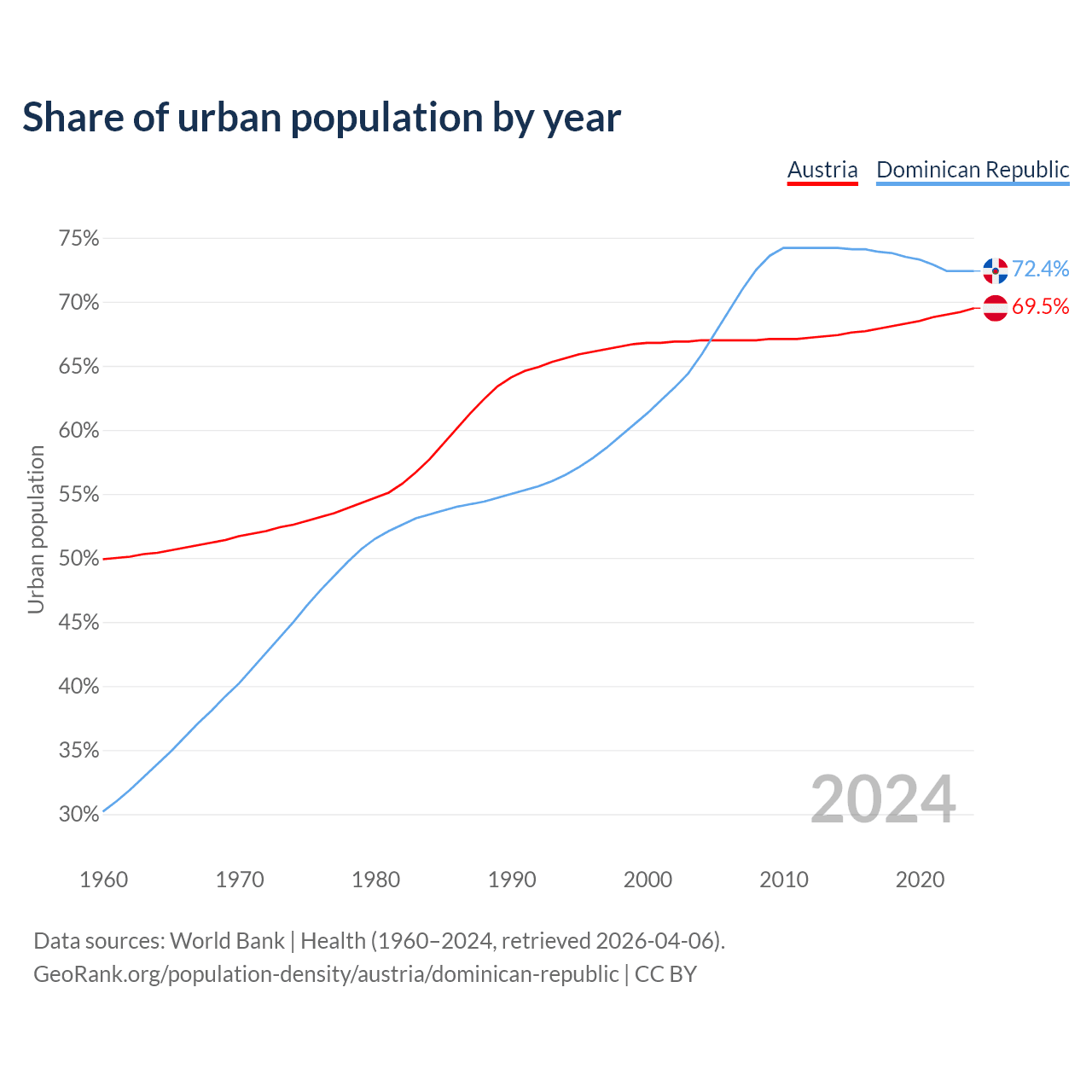 From 2004 to 2024, the share of urban population changed from 67% to 69.5% in Austria and from 65.9% to 72.4% in the Dominican Republic.
