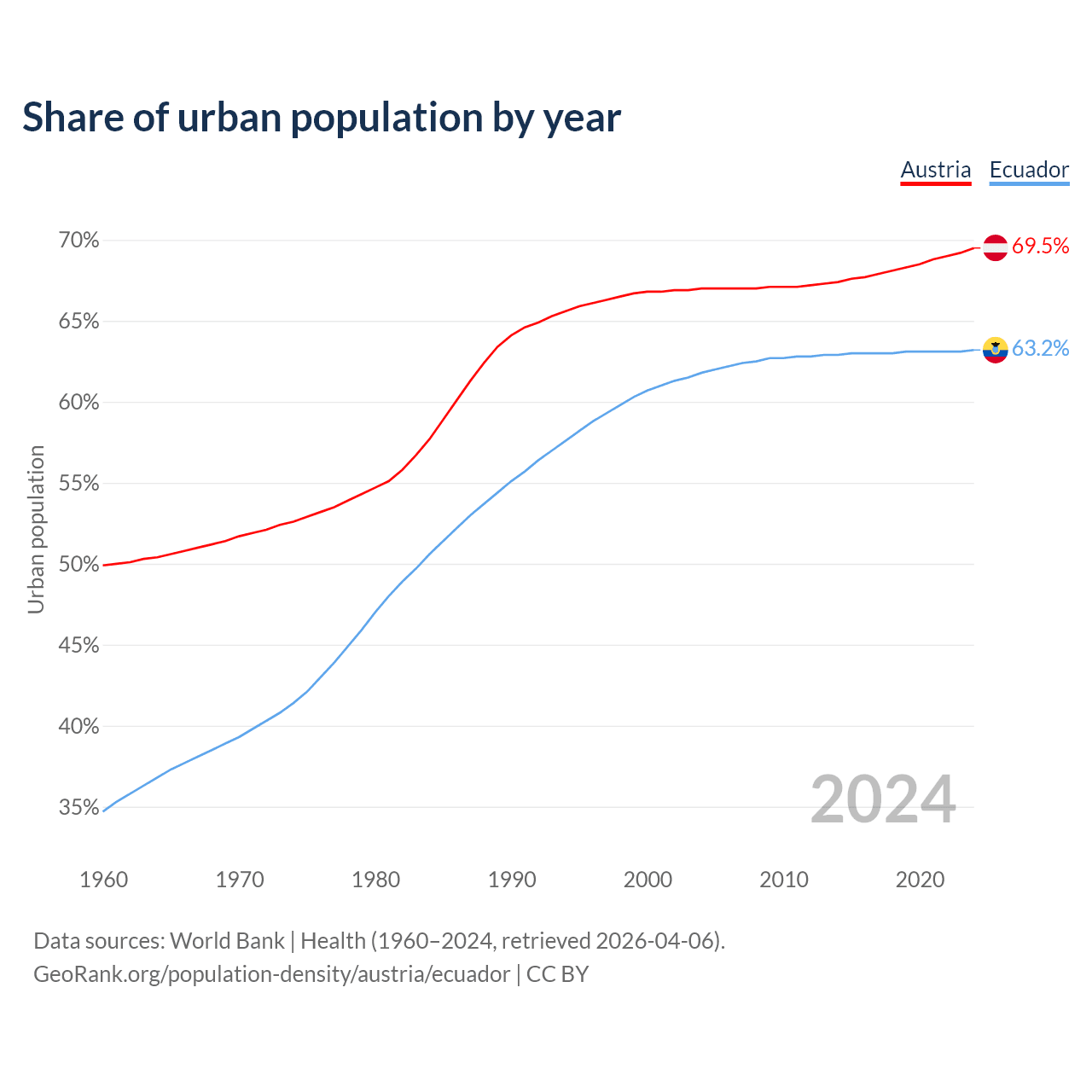 From 2004 to 2024, the share of urban population changed from 67% to 69.5% in Austria and from 61.8% to 63.2% in Ecuador.
