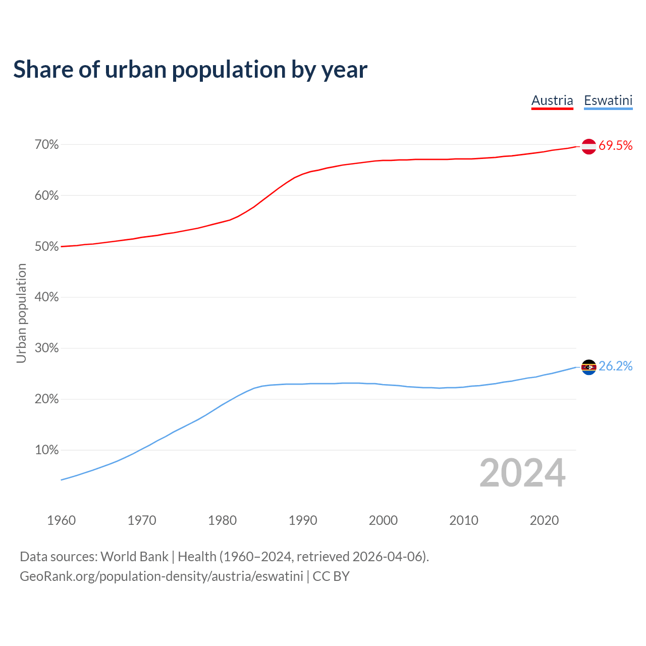 From 2004 to 2024, the share of urban population changed from 67% to 69.5% in Austria and from 22.3% to 26.2% in Eswatini.
