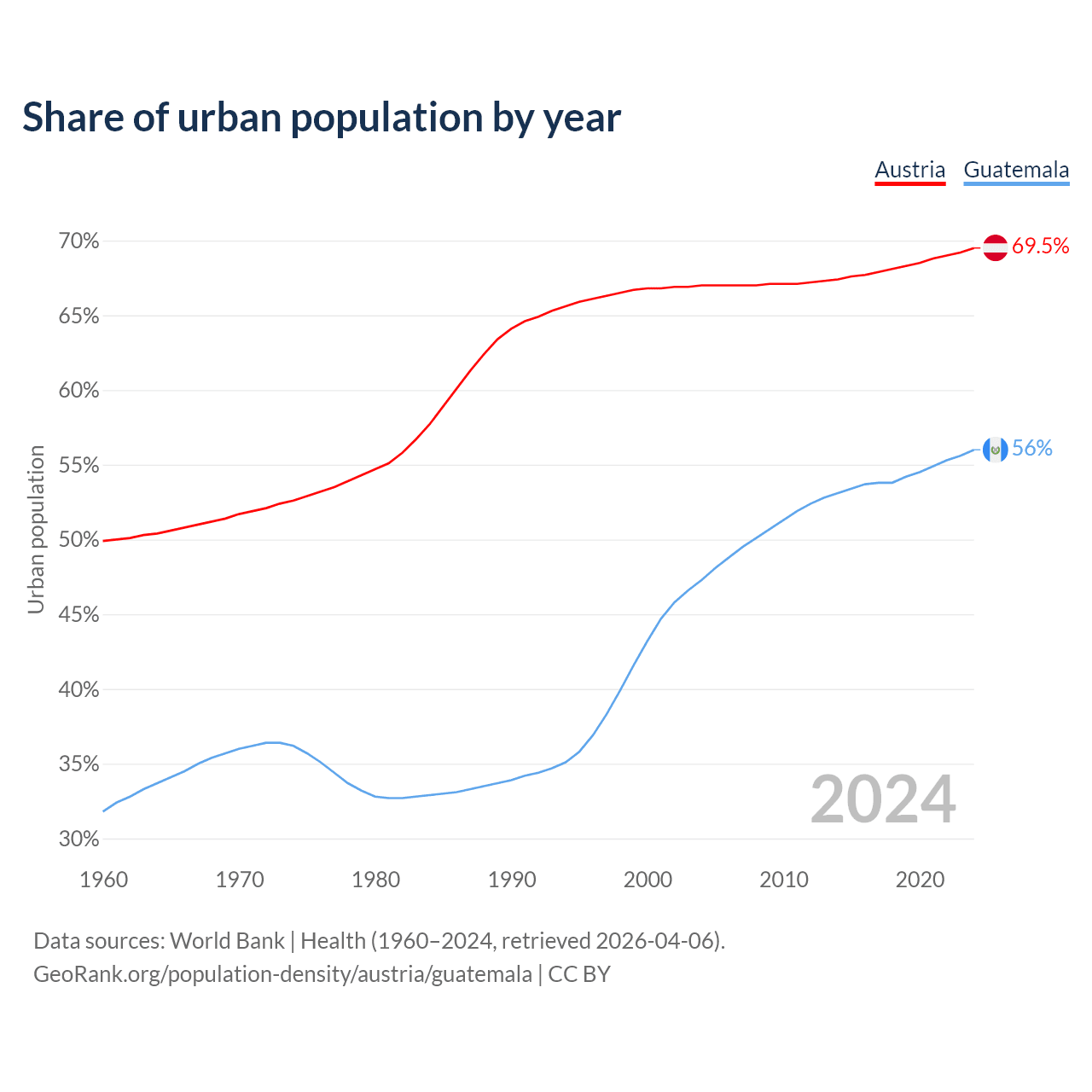 From 2004 to 2024, the share of urban population changed from 67% to 69.5% in Austria and from 47.3% to 56% in Guatemala.