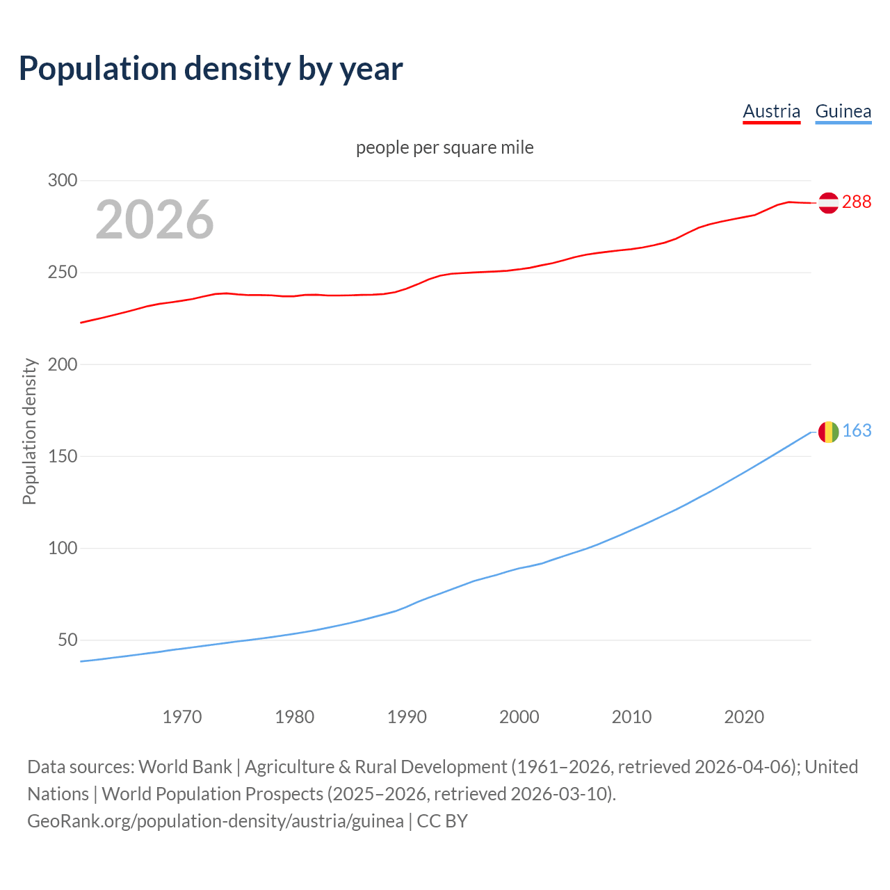 From 2006 to 2026, population density in Austria increased by 10.8%, compared to a 63.7% growth in Guinea.