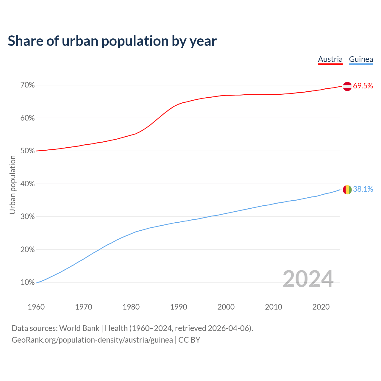 From 2004 to 2024, the share of urban population changed from 67% to 69.5% in Austria and from 32.1% to 38.1% in Guinea.