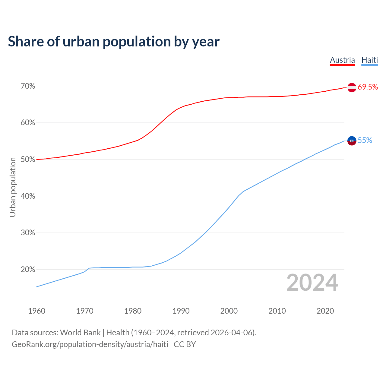 From 2004 to 2024, the share of urban population changed from 67% to 69.5% in Austria and from 41.9% to 55% in Haiti.