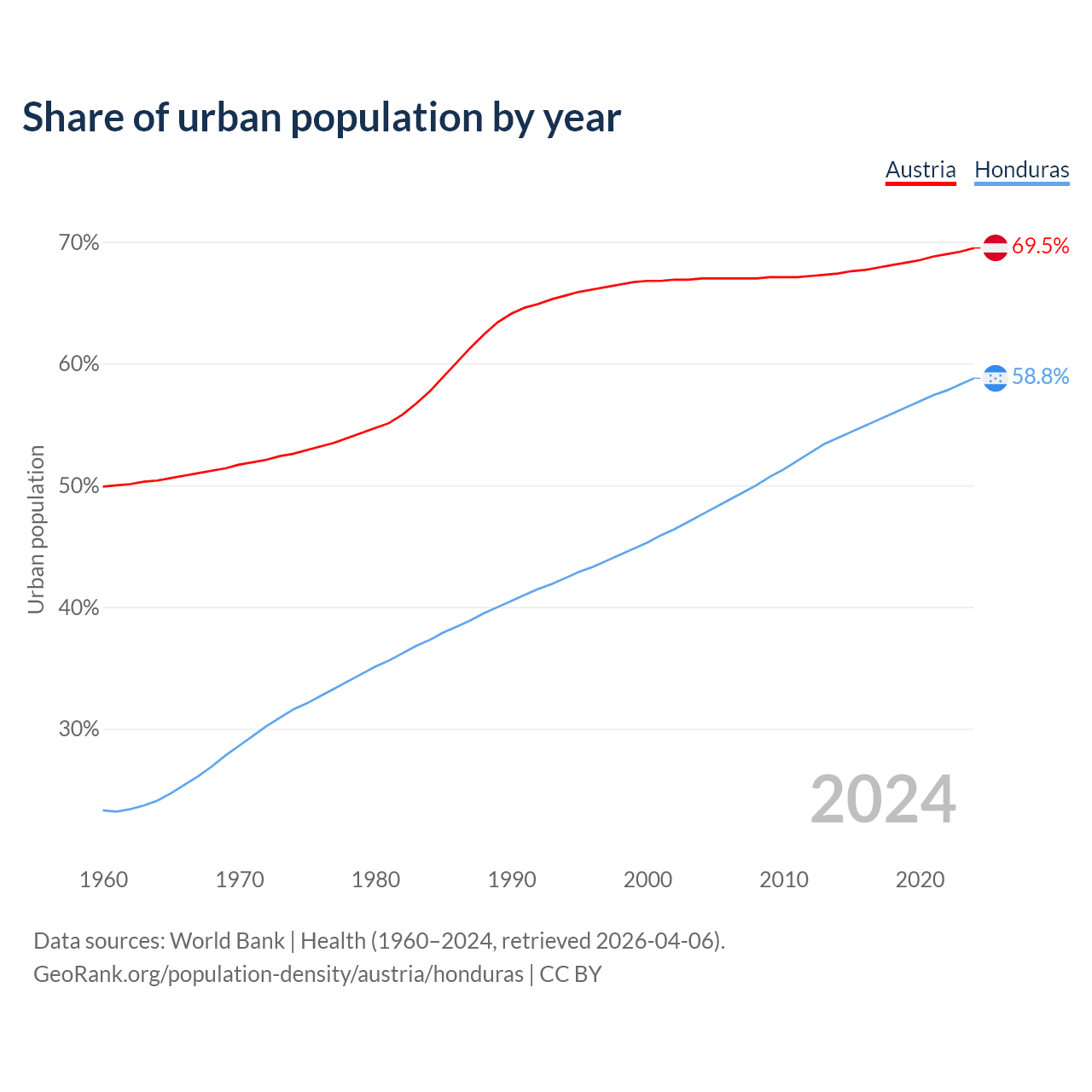 From 2004 to 2024, the share of urban population changed from 67% to 69.5% in Austria and from 47.6% to 58.8% in Honduras.