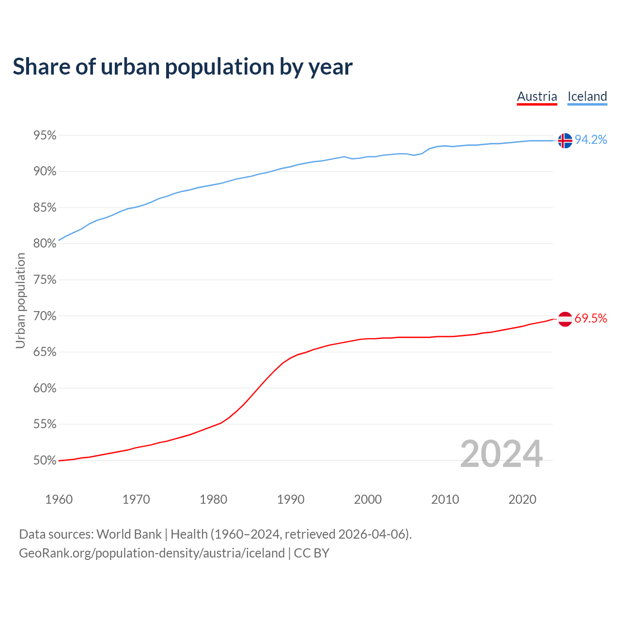 From 2004 to 2024, the share of urban population changed from 67% to 69.5% in Austria and from 92.4% to 94.2% in Iceland.