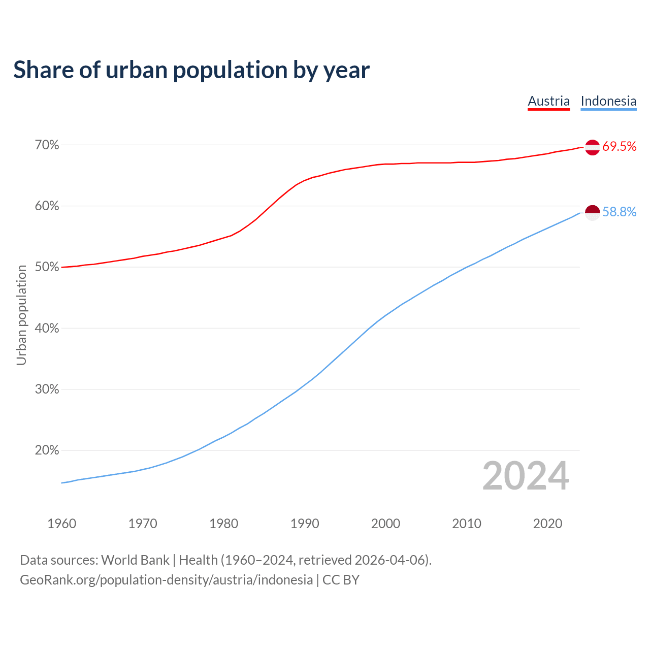 From 2004 to 2024, the share of urban population changed from 67% to 69.5% in Austria and from 45.4% to 58.8% in Indonesia.