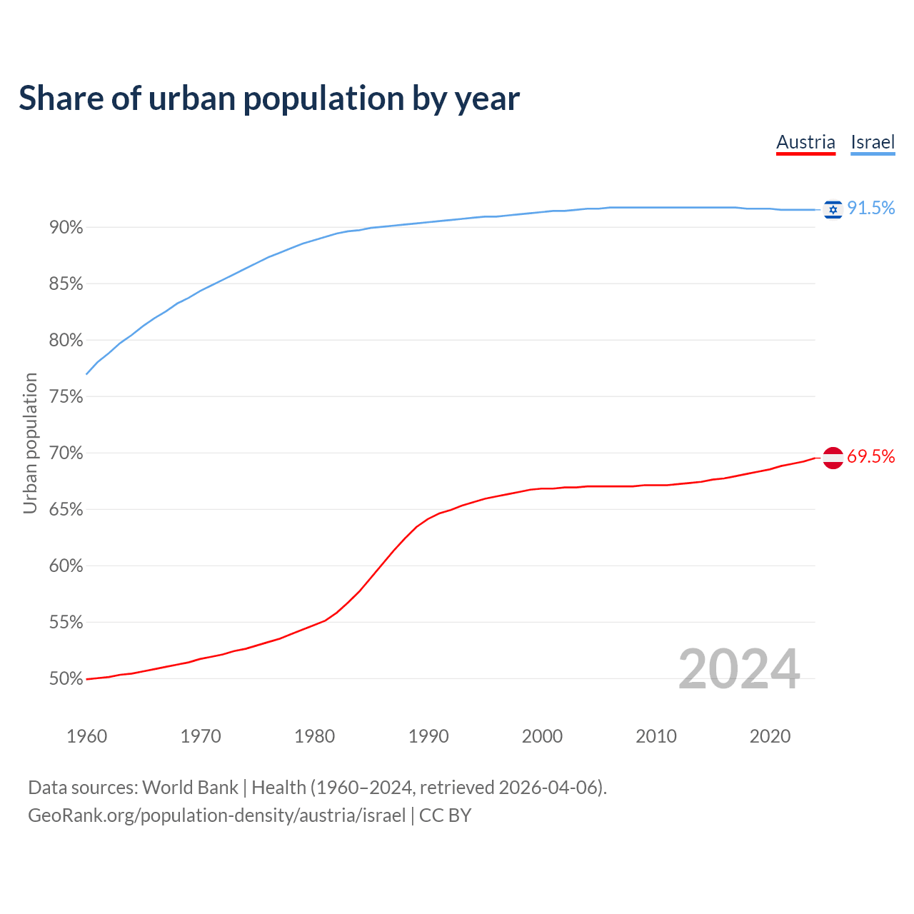 From 2004 to 2024, the share of urban population changed from 67% to 69.5% in Austria and from 91.6% to 91.5% in Israel.
