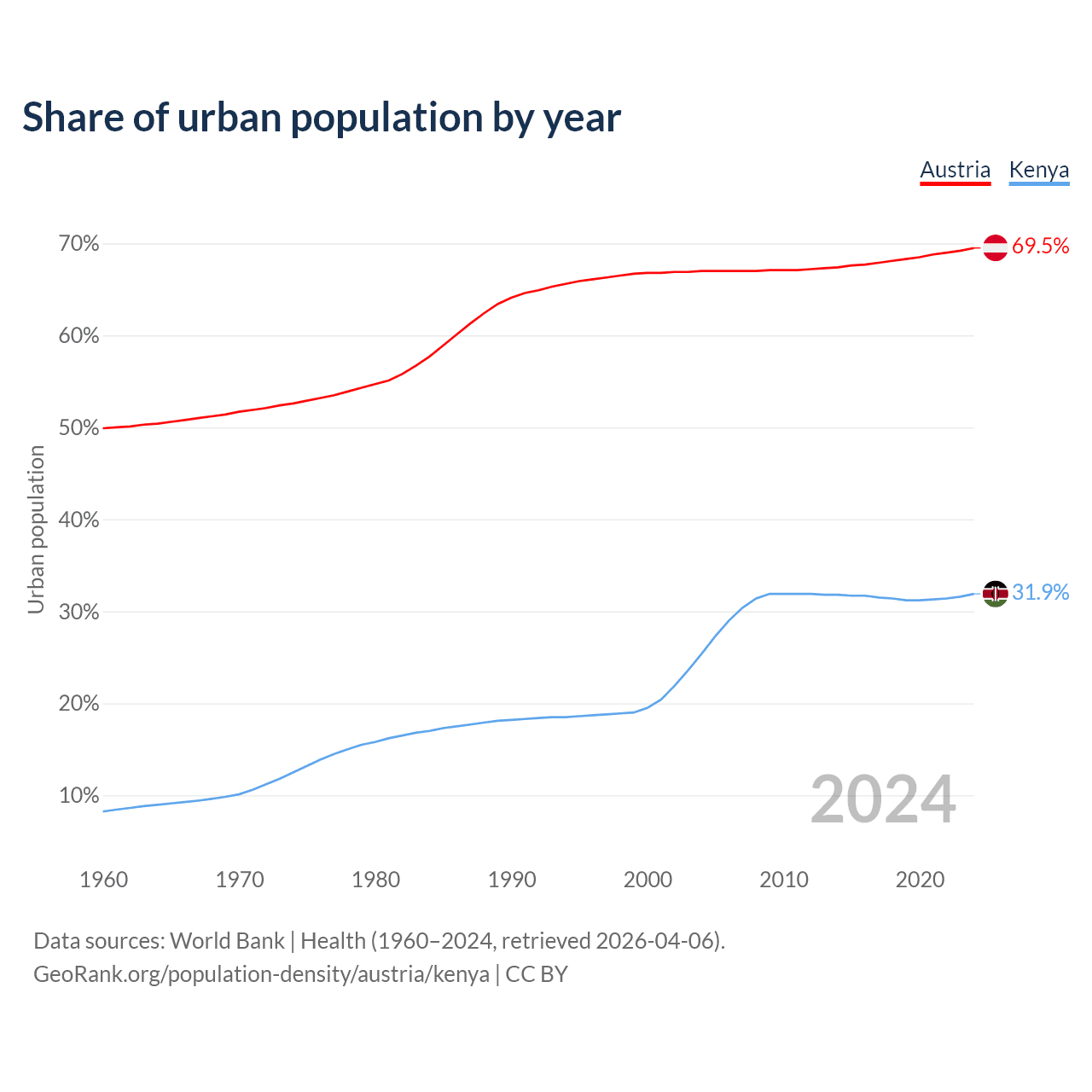 From 2004 to 2024, the share of urban population changed from 67% to 69.5% in Austria and from 25.4% to 31.9% in Kenya.