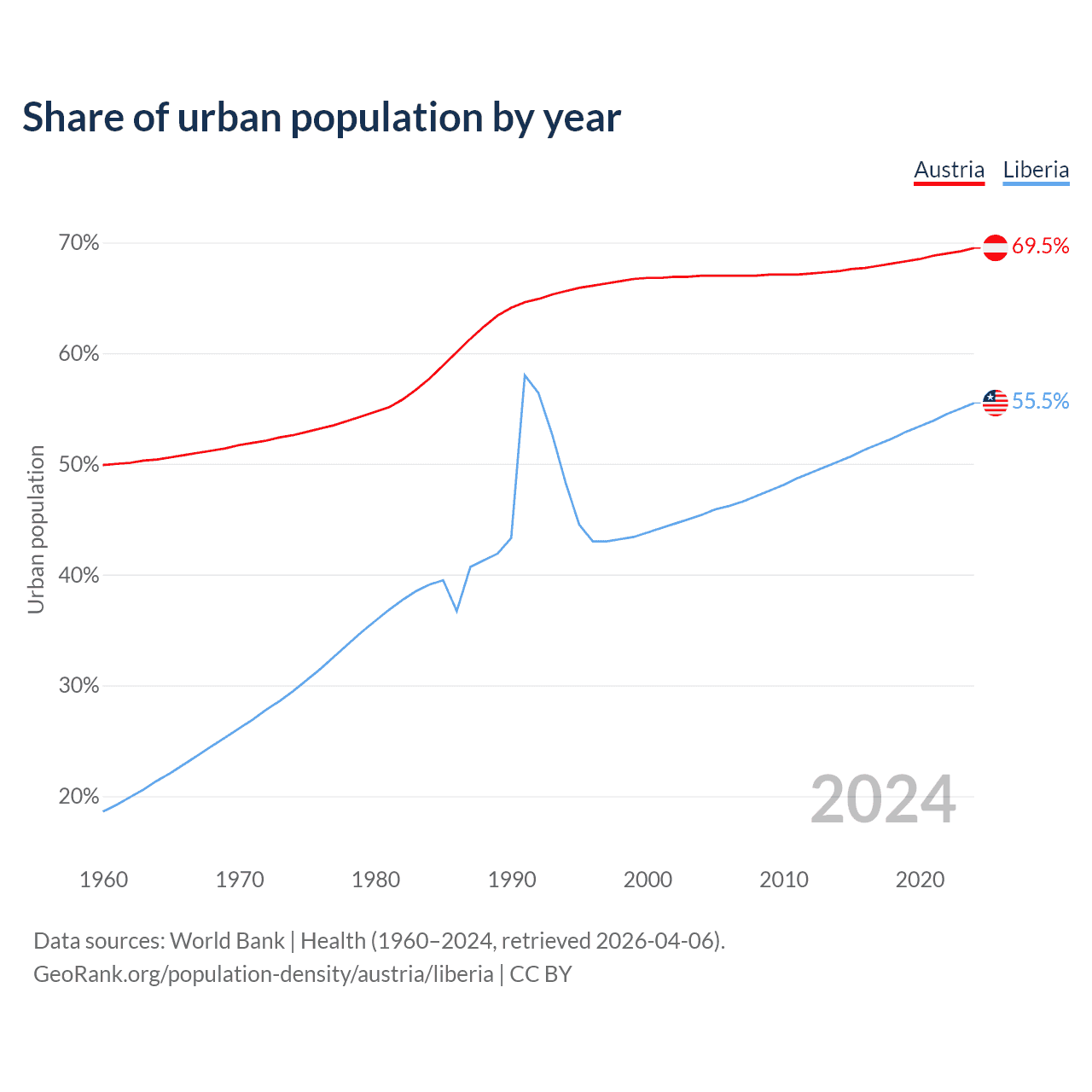 From 2004 to 2024, the share of urban population changed from 67% to 69.5% in Austria and from 45.4% to 55.5% in Liberia.