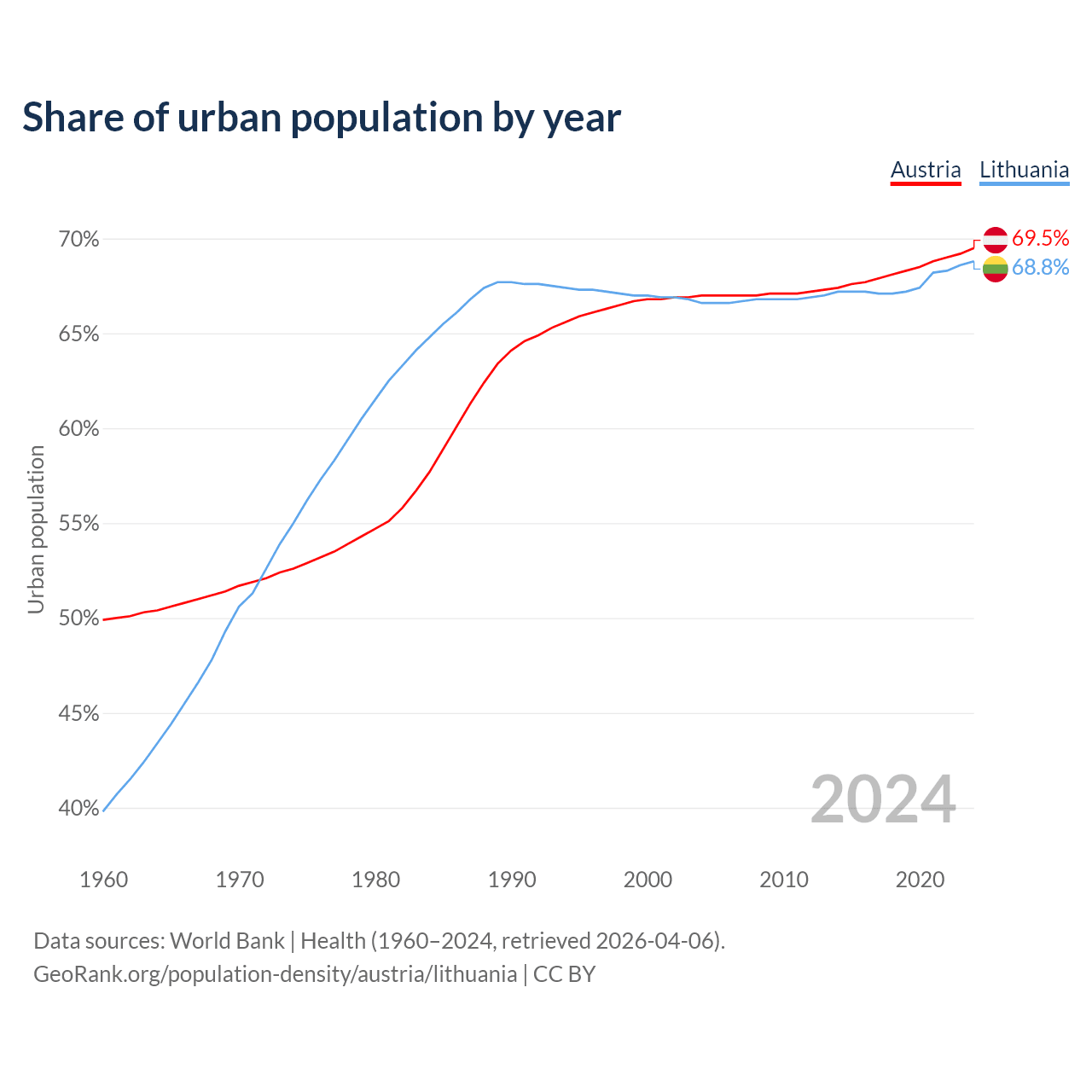 From 2004 to 2024, the share of urban population changed from 67% to 69.5% in Austria and from 66.6% to 68.8% in Lithuania.