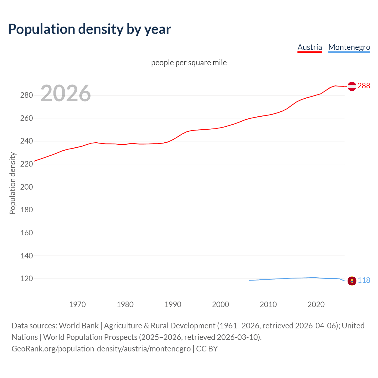 From 2006 to 2026, population density in Austria increased by 10.8%, compared to a 0.44% decline in Montenegro.