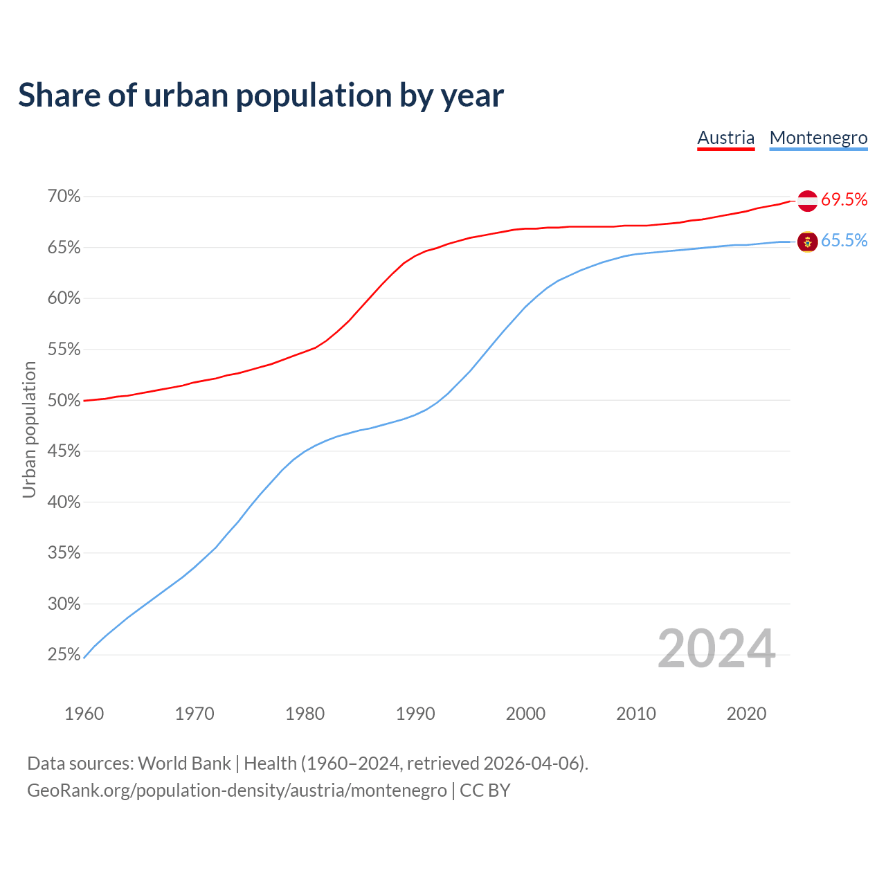 From 2004 to 2024, the share of urban population changed from 67% to 69.5% in Austria and from 62.2% to 65.5% in Montenegro.