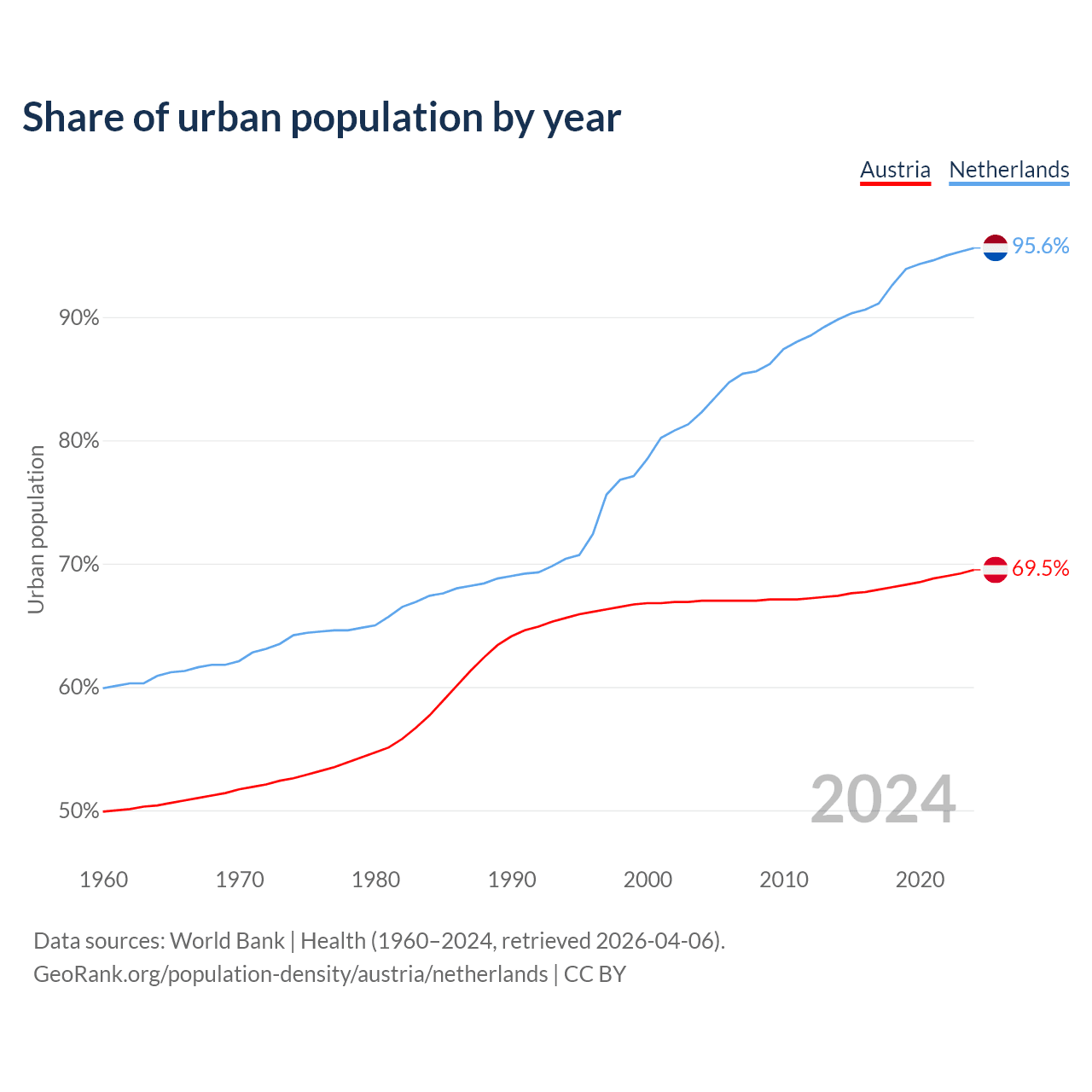 From 2004 to 2024, the share of urban population changed from 67% to 69.5% in Austria and from 82.3% to 95.6% in the Netherlands.