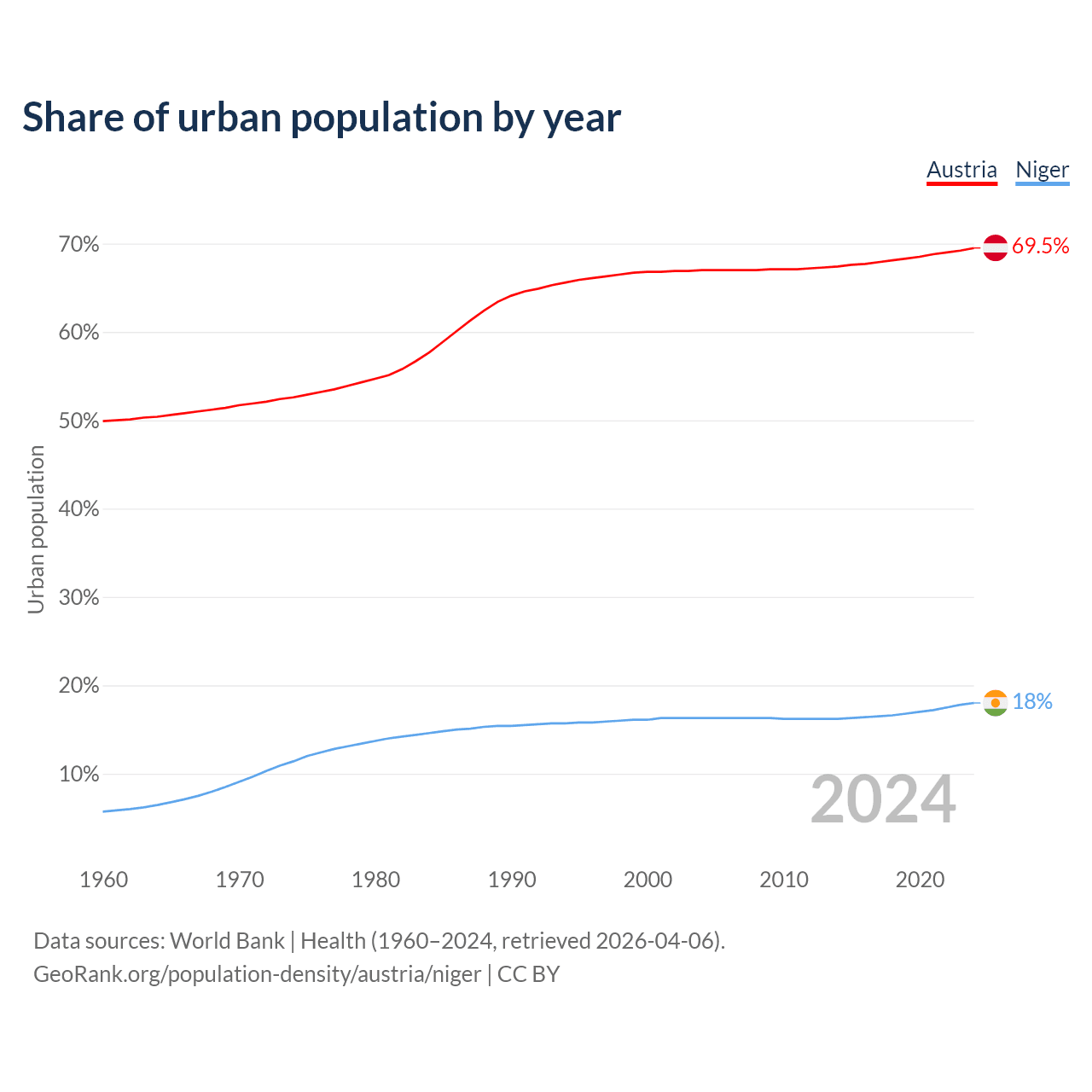 From 2004 to 2024, the share of urban population changed from 67% to 69.5% in Austria and from 16.3% to 18% in Niger.
