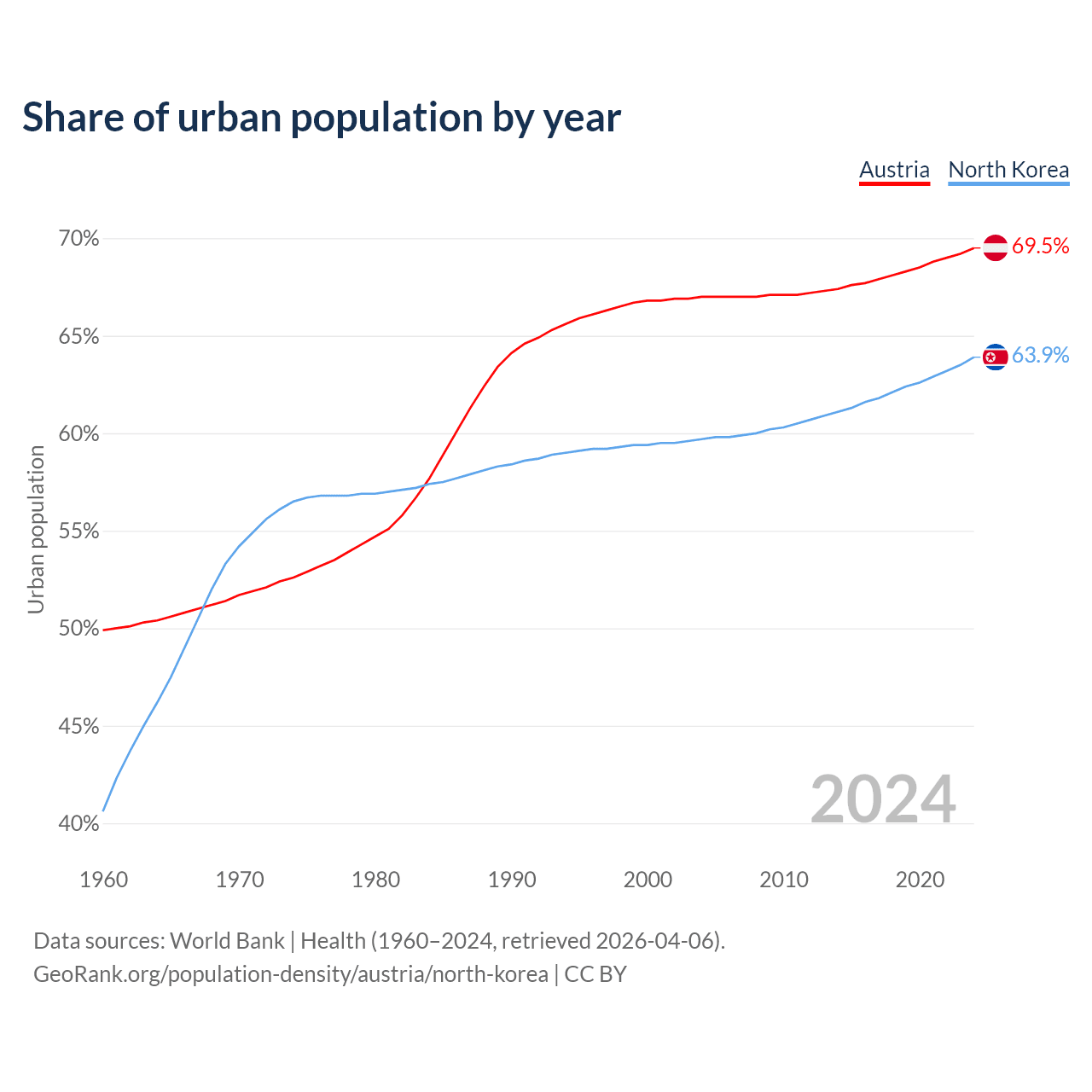 From 2004 to 2024, the share of urban population changed from 67% to 69.5% in Austria and from 59.7% to 63.9% in North Korea.