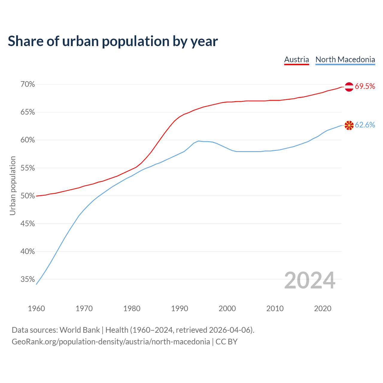From 2004 to 2024, the share of urban population changed from 67% to 69.5% in Austria and from 57.9% to 62.6% in North Macedonia.