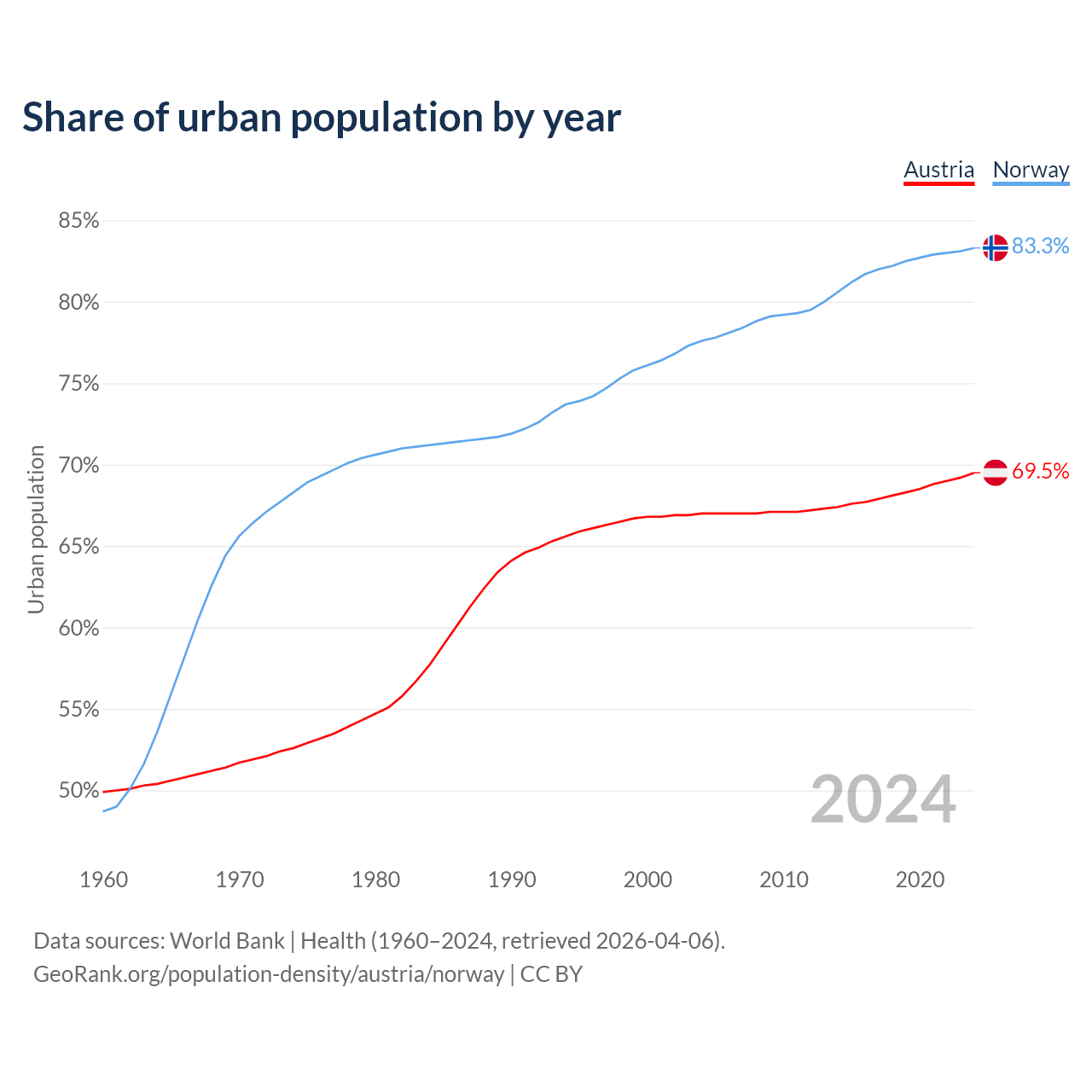 From 2004 to 2024, the share of urban population changed from 67% to 69.5% in Austria and from 77.6% to 83.3% in Norway.