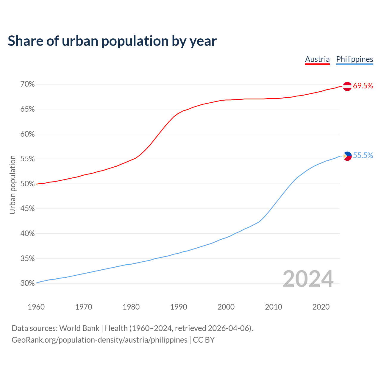 From 2004 to 2024, the share of urban population changed from 67% to 69.5% in Austria and from 40.9% to 55.5% in the Philippines.