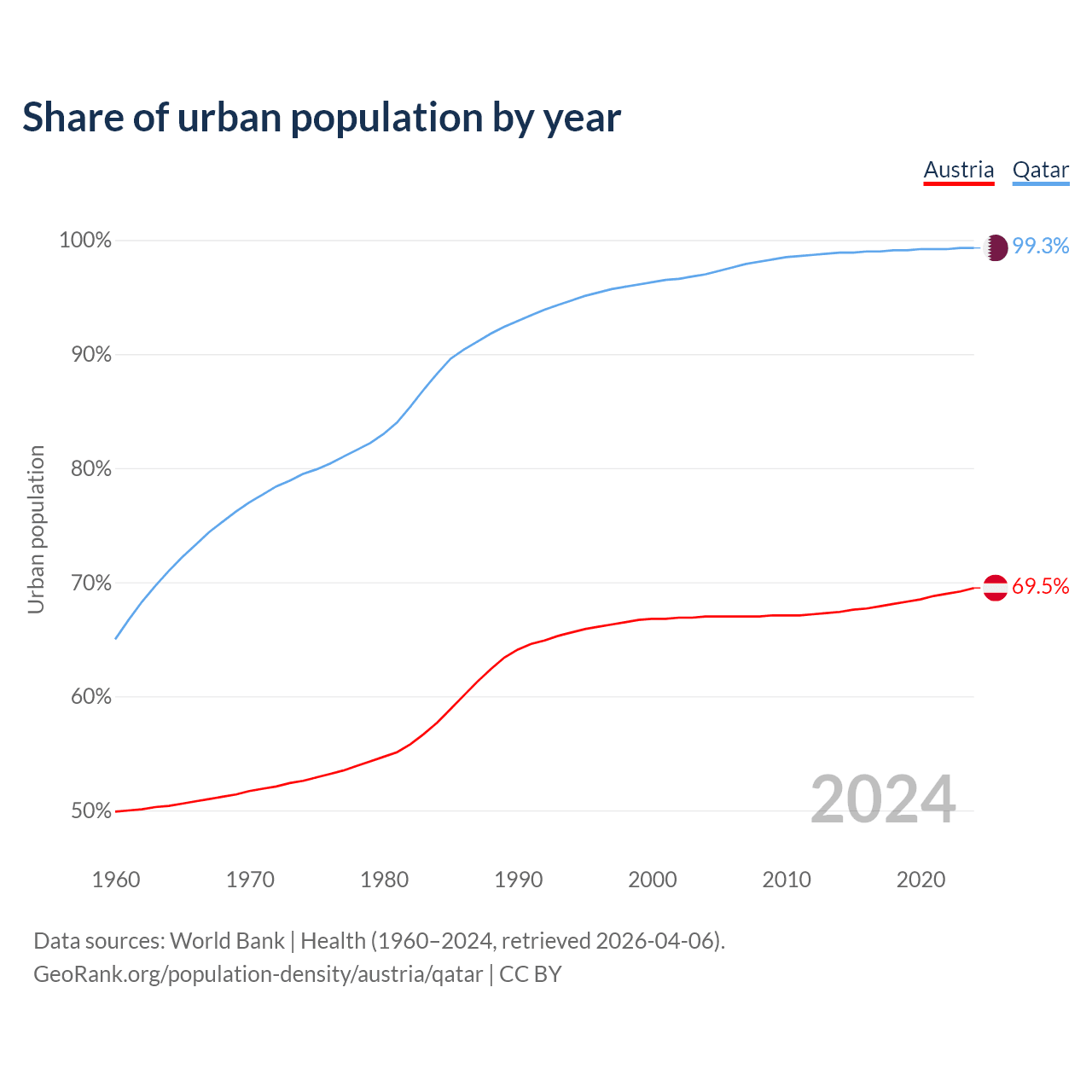From 2004 to 2024, the share of urban population changed from 67% to 69.5% in Austria and from 97% to 99.3% in Qatar.