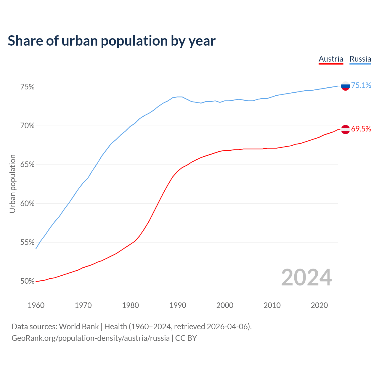 From 2004 to 2024, the share of urban population changed from 67% to 69.5% in Austria and from 73.3% to 75.1% in Russia.