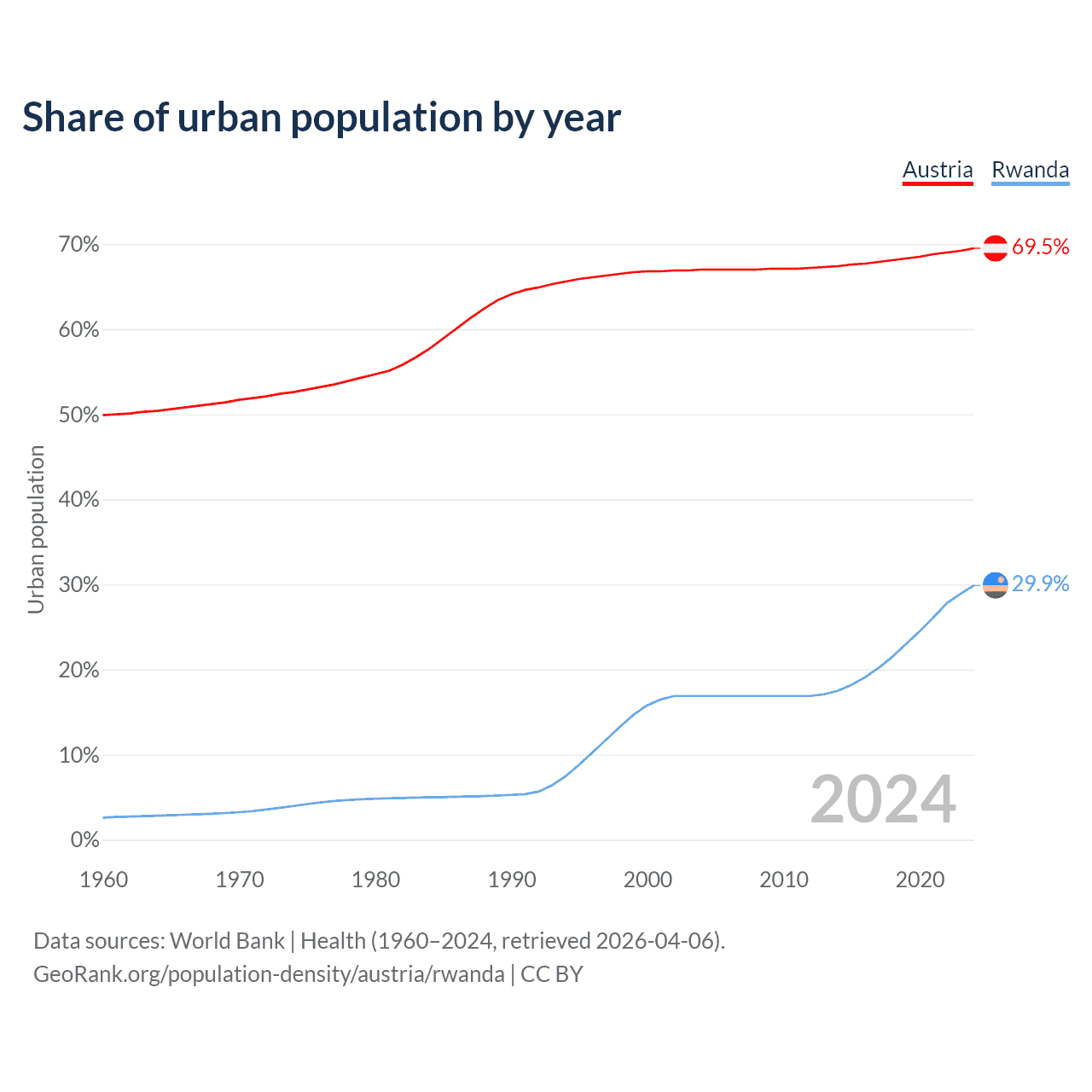 From 2004 to 2024, the share of urban population changed from 67% to 69.5% in Austria and from 16.9% to 29.9% in Rwanda.