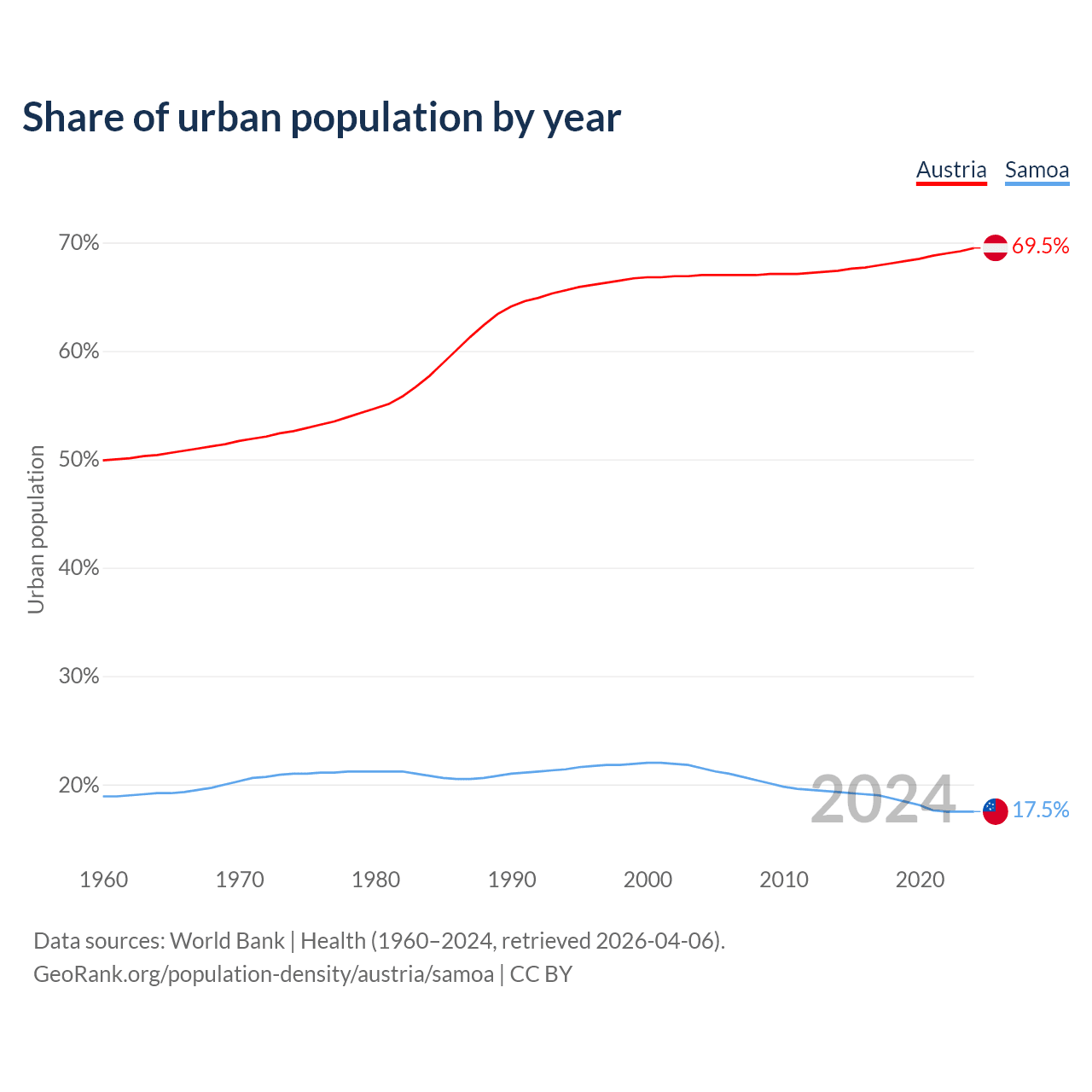 From 2004 to 2024, the share of urban population changed from 67% to 69.5% in Austria and from 21.5% to 17.5% in Samoa.