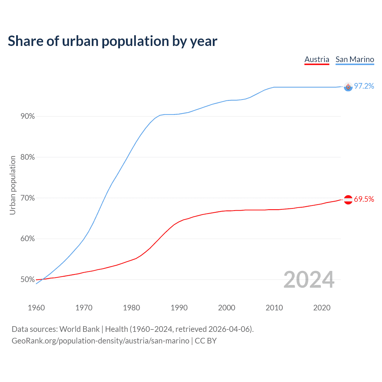 From 2004 to 2024, the share of urban population changed from 67% to 69.5% in Austria and from 94.2% to 97.2% in San Marino.