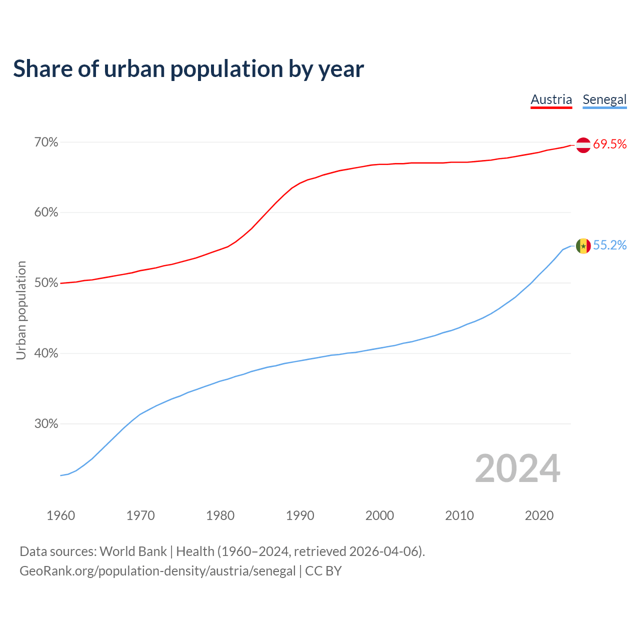 From 2004 to 2024, the share of urban population changed from 67% to 69.5% in Austria and from 41.6% to 55.2% in Senegal.