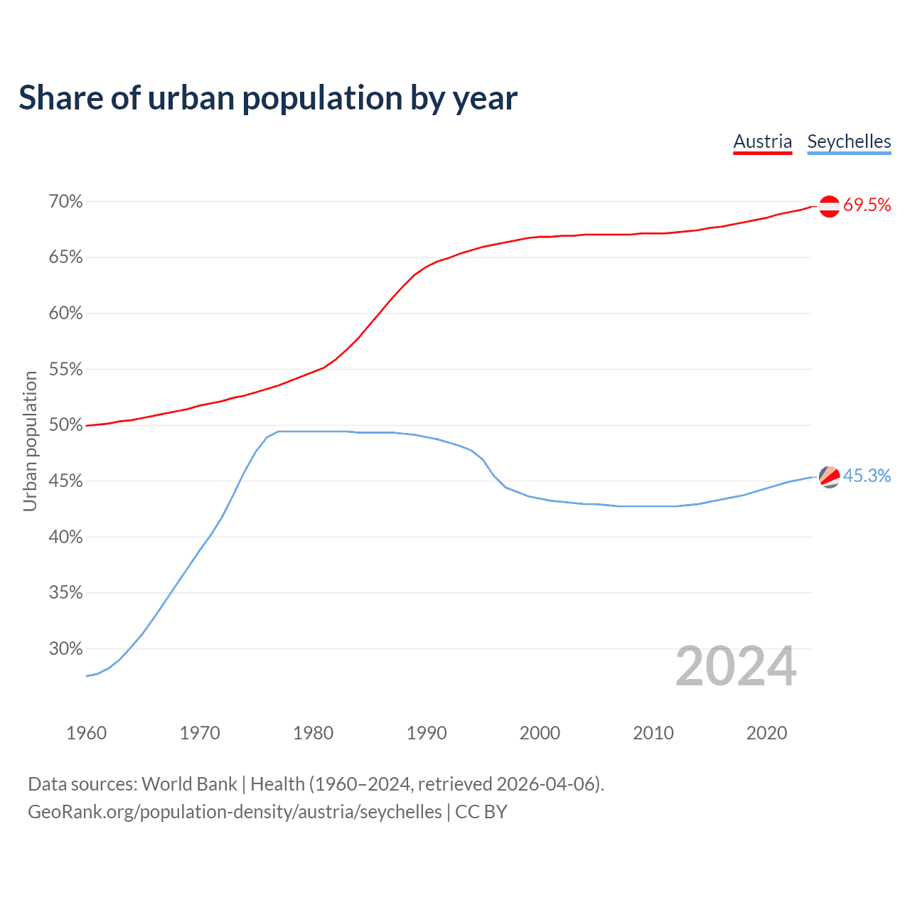 From 2004 to 2024, the share of urban population changed from 67% to 69.5% in Austria and from 42.9% to 45.3% in the Seychelles.