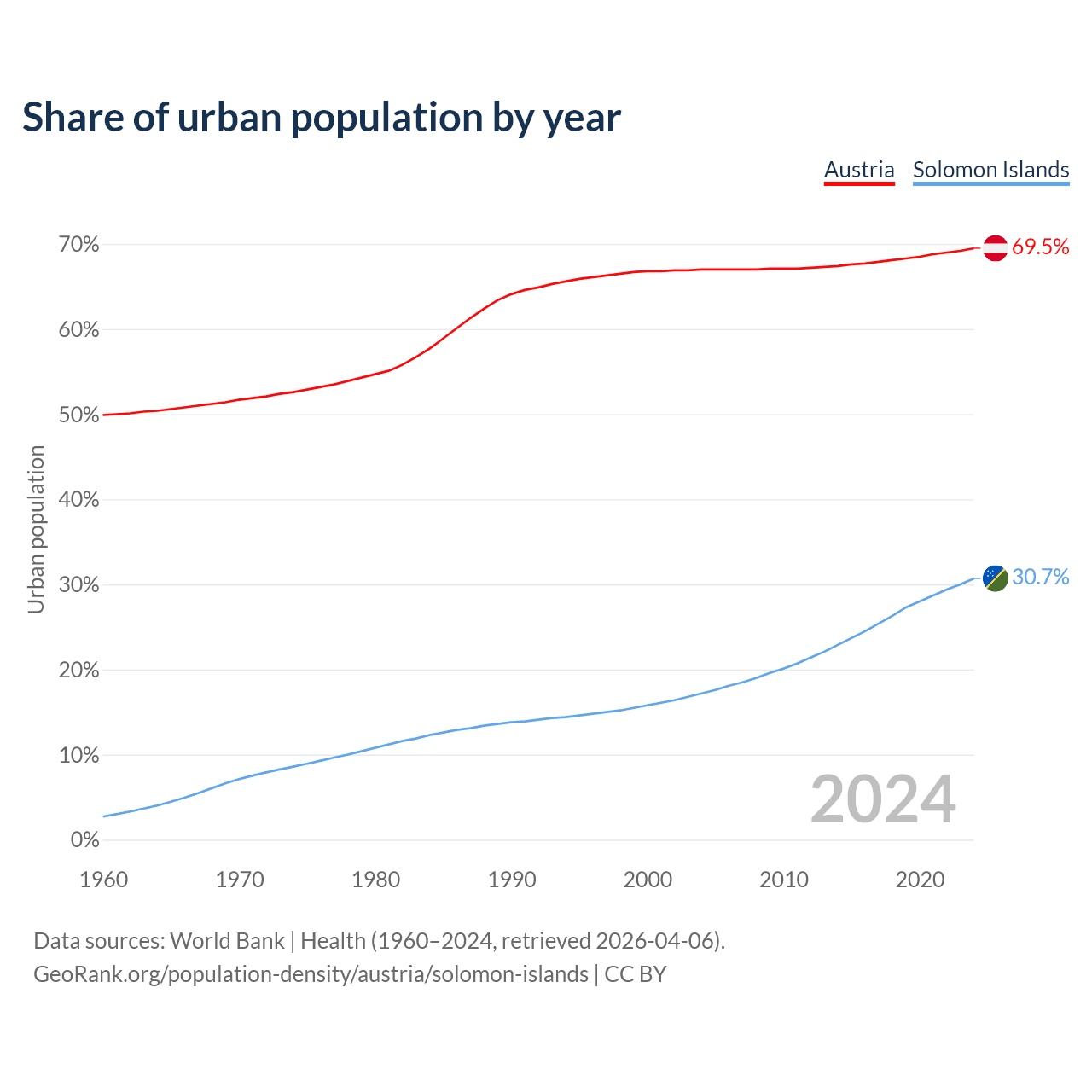 From 2004 to 2024, the share of urban population changed from 67% to 69.5% in Austria and from 17.2% to 30.7% in the Solomon Islands.