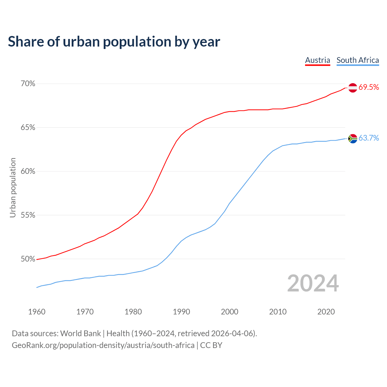 From 2004 to 2024, the share of urban population changed from 67% to 69.5% in Austria and from 59.1% to 63.7% in South Africa.