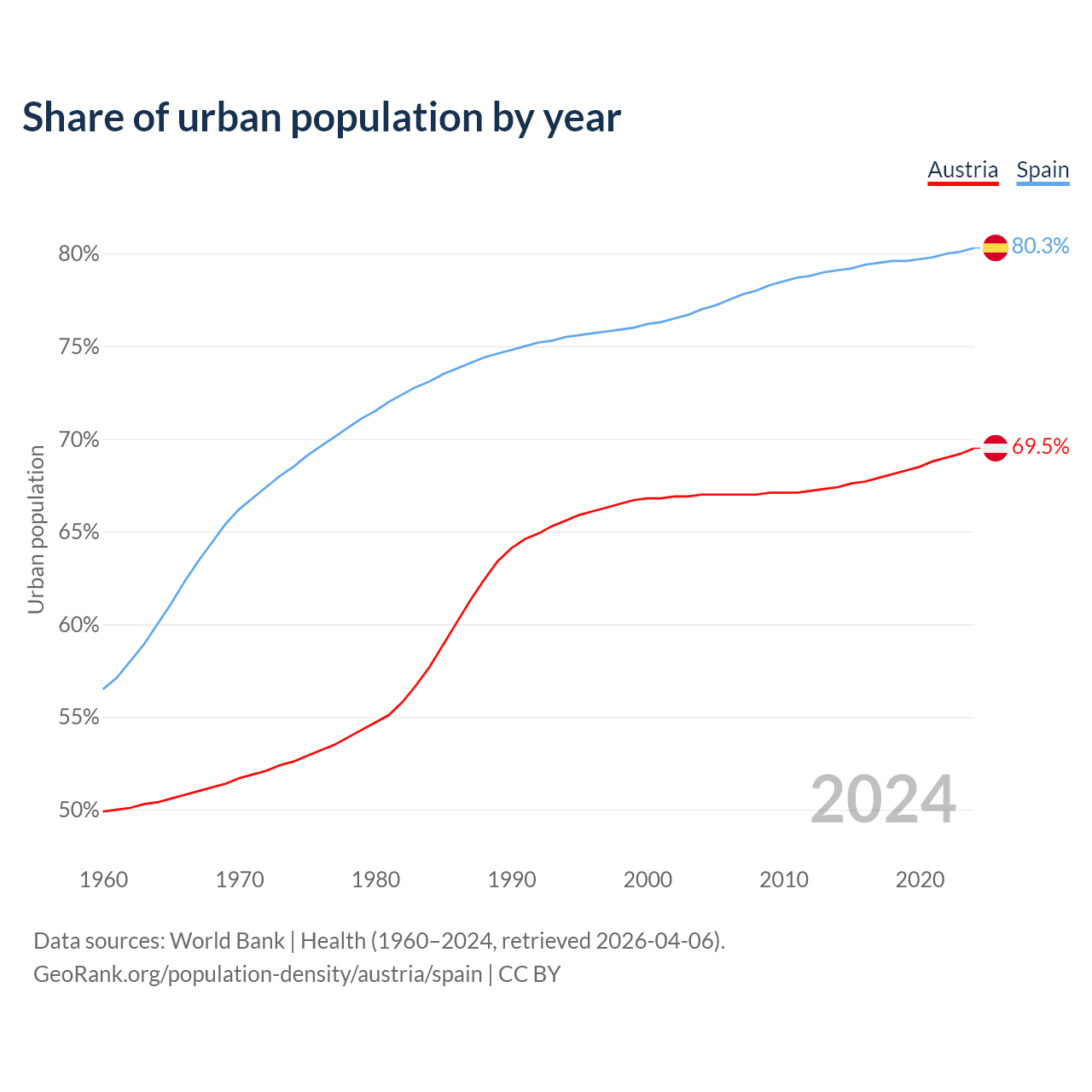 From 2004 to 2024, the share of urban population changed from 67% to 69.5% in Austria and from 77% to 80.3% in Spain.