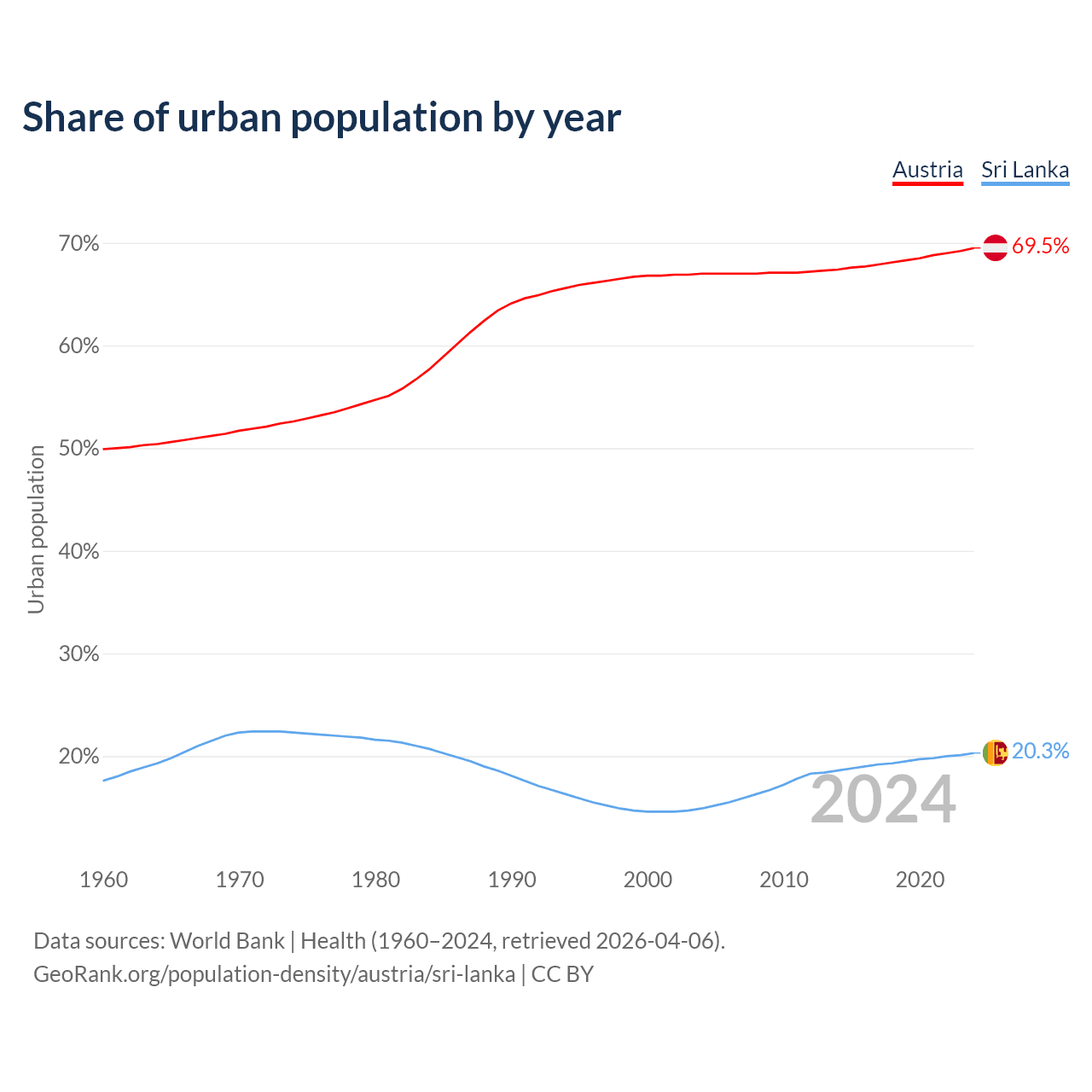 From 2004 to 2024, the share of urban population changed from 67% to 69.5% in Austria and from 14.9% to 20.3% in Sri Lanka.