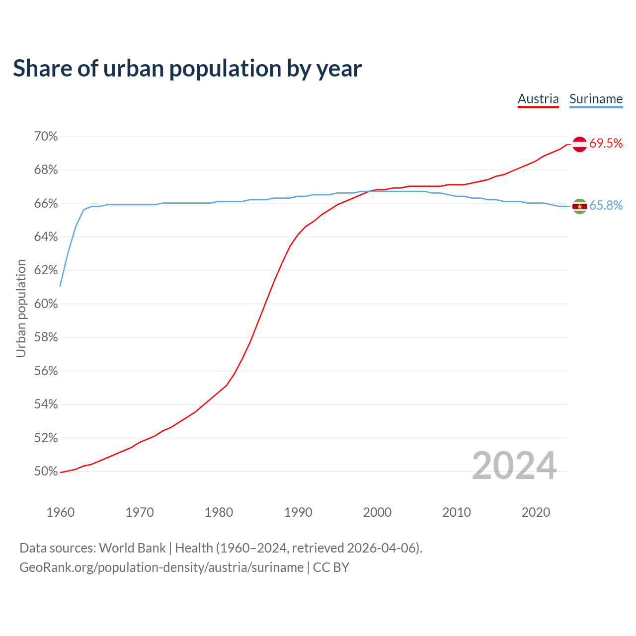 From 2004 to 2024, the share of urban population changed from 67% to 69.5% in Austria and from 66.7% to 65.8% in Suriname.