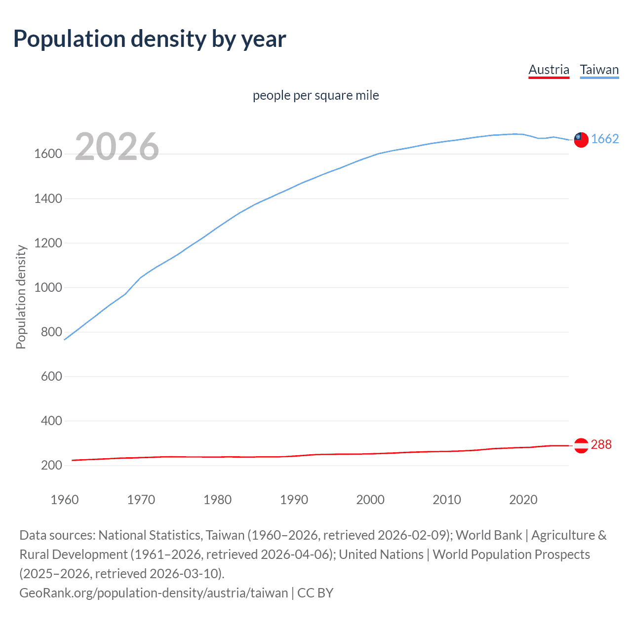 From 2006 to 2026, population density in Austria increased by 10.8%, compared to a 1.78% growth in Taiwan.