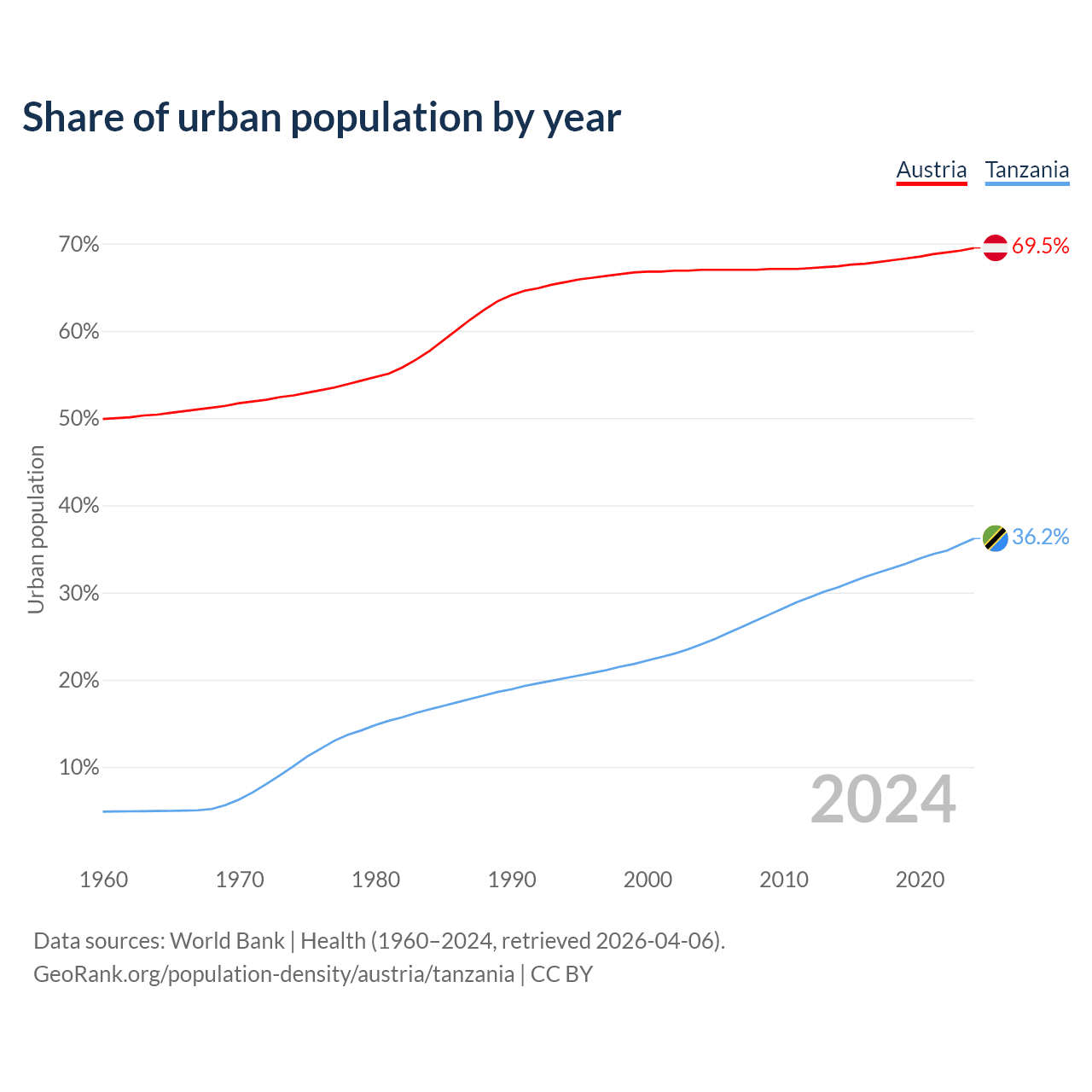 From 2004 to 2024, the share of urban population changed from 67% to 69.5% in Austria and from 24.1% to 36.2% in Tanzania.