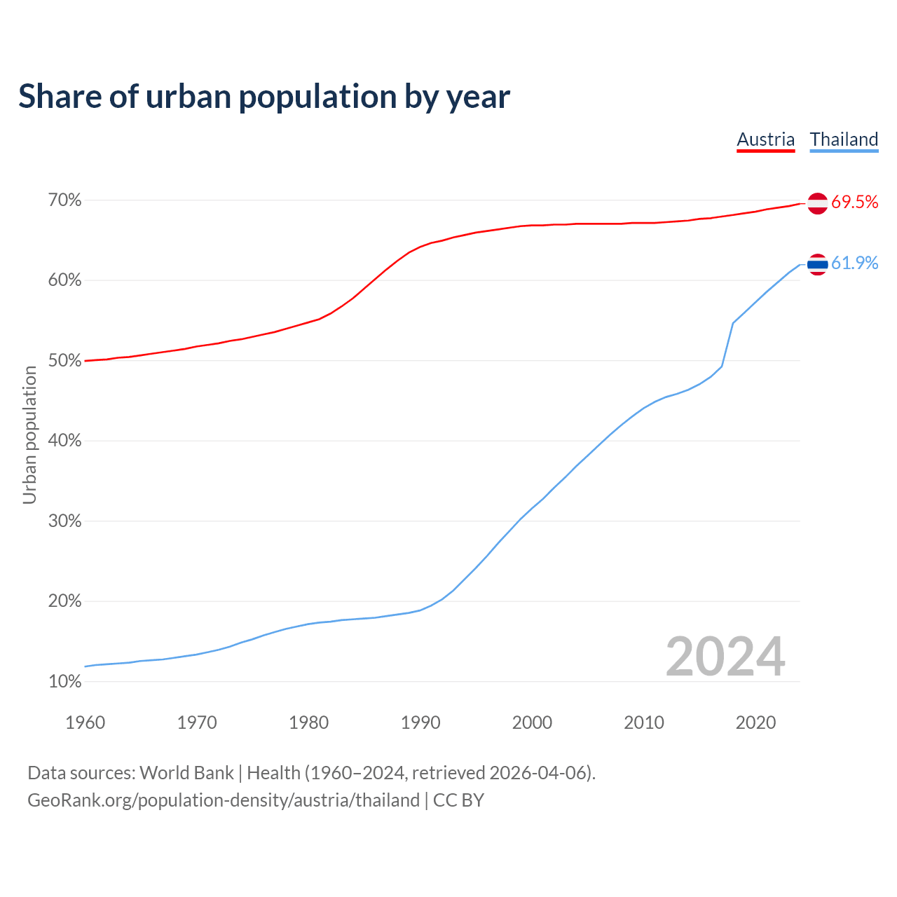 From 2004 to 2024, the share of urban population changed from 67% to 69.5% in Austria and from 36.8% to 61.9% in Thailand.