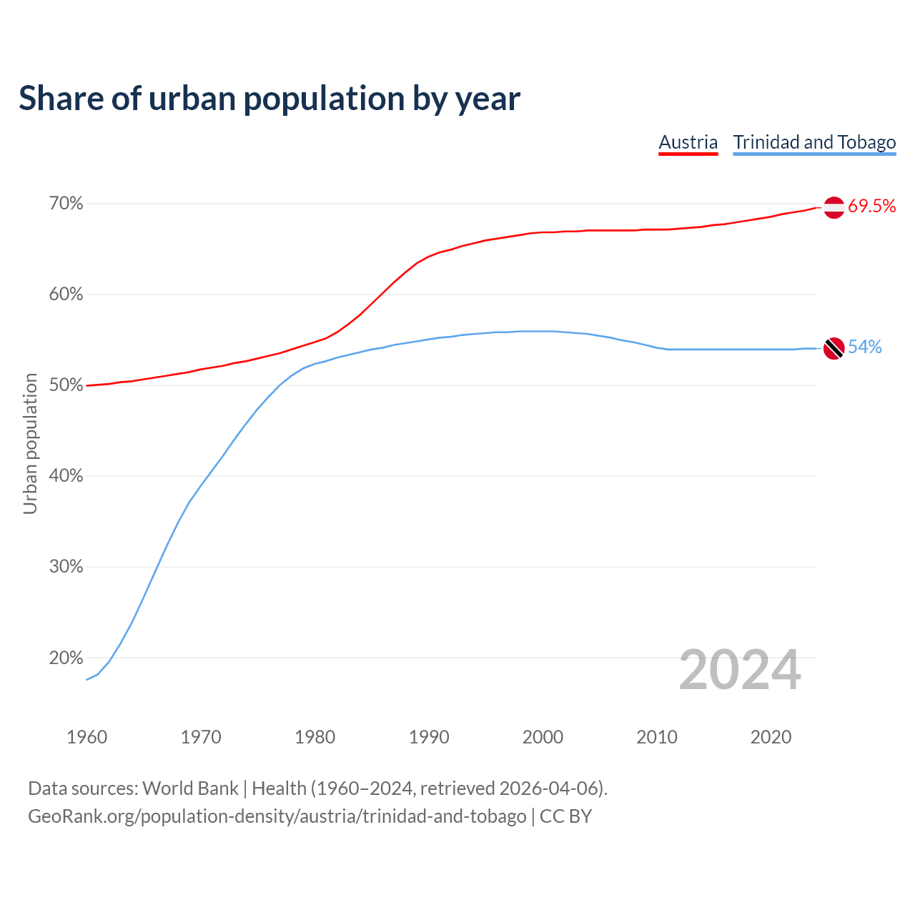 From 2004 to 2024, the share of urban population changed from 67% to 69.5% in Austria and from 55.6% to 54% in Trinidad and Tobago.