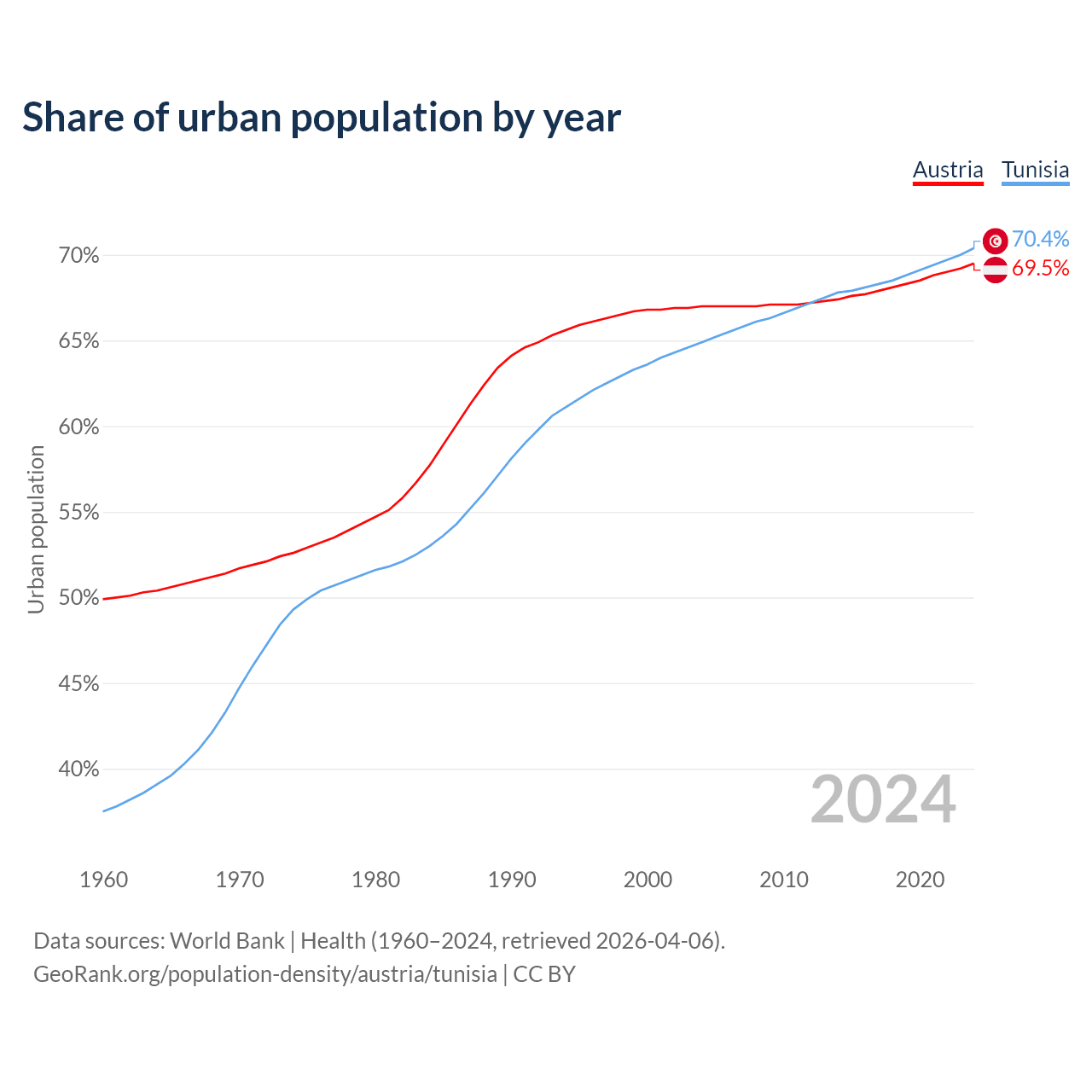 From 2004 to 2024, the share of urban population changed from 67% to 69.5% in Austria and from 64.9% to 70.4% in Tunisia.