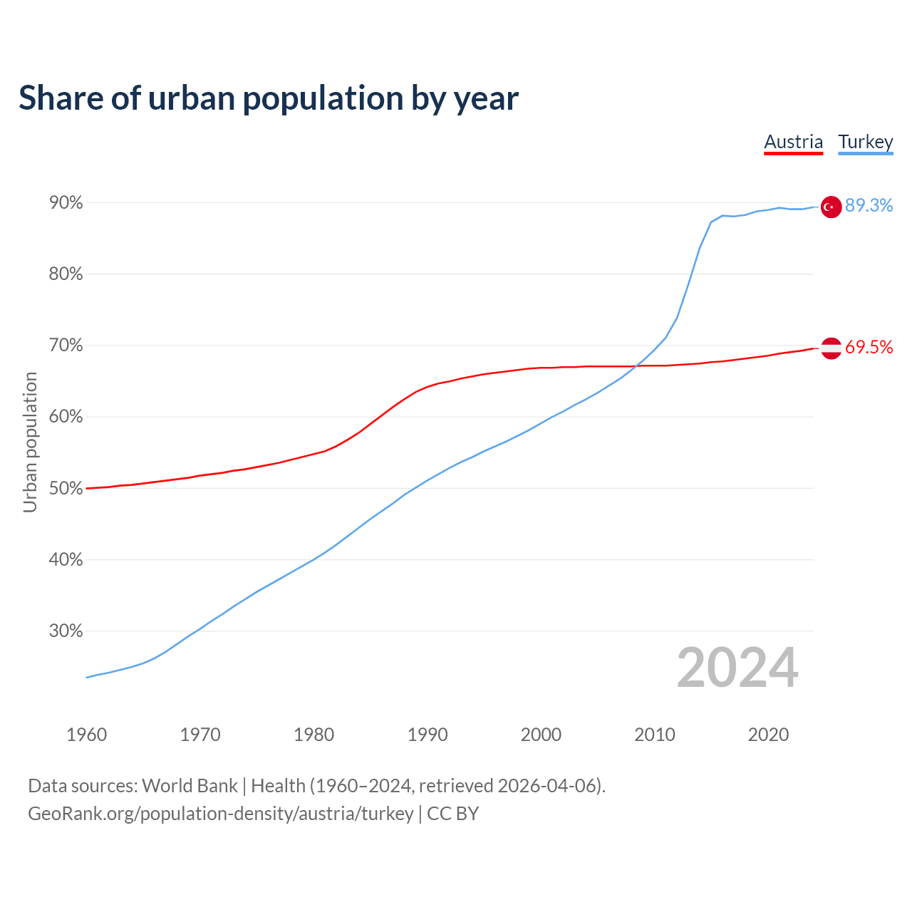 From 2004 to 2024, the share of urban population changed from 67% to 69.5% in Austria and from 62.4% to 89.3% in Turkey.