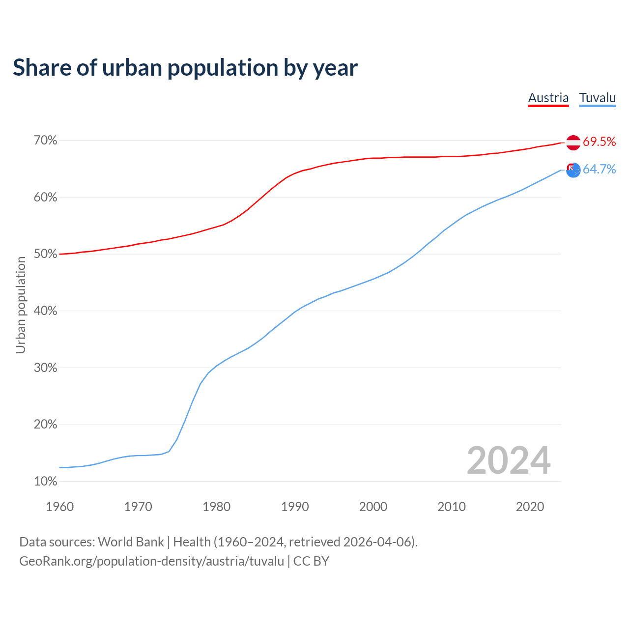 From 2004 to 2024, the share of urban population changed from 67% to 69.5% in Austria and from 48.4% to 64.7% in Tuvalu.