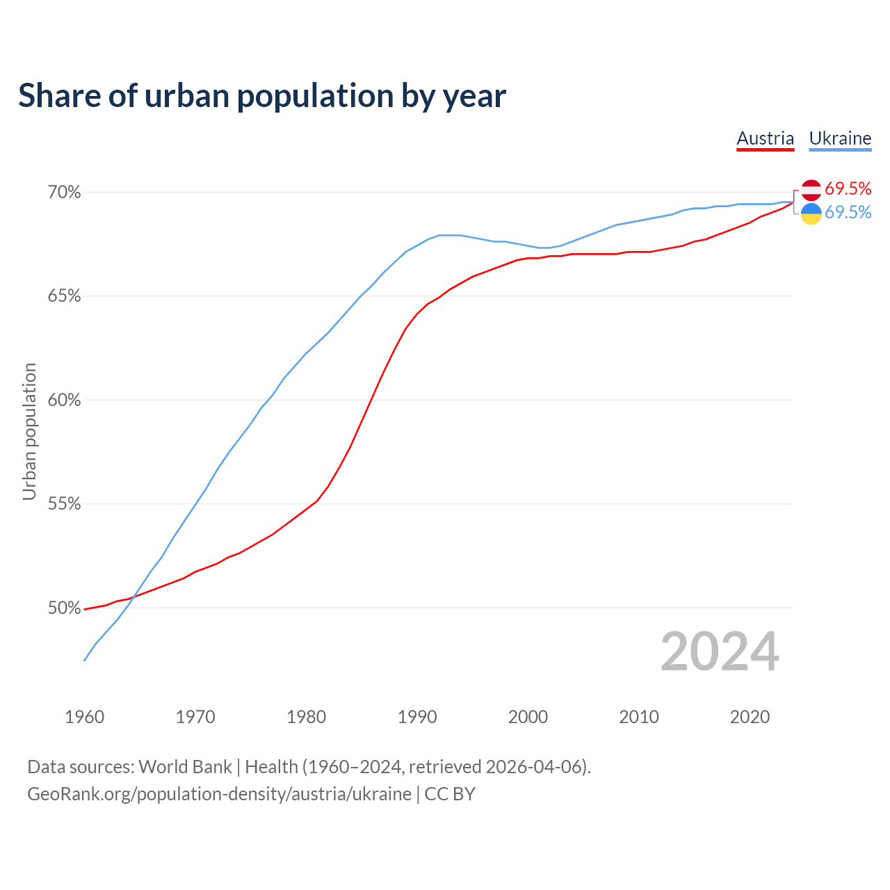 From 2004 to 2024, the share of urban population changed from 67% to 69.5% in Austria and from 67.6% to 69.5% in Ukraine.