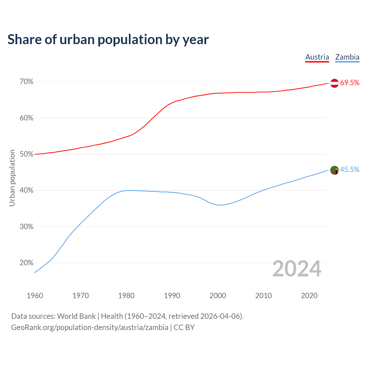 From 2004 to 2024, the share of urban population changed from 67% to 69.5% in Austria and from 36.8% to 45.5% in Zambia.