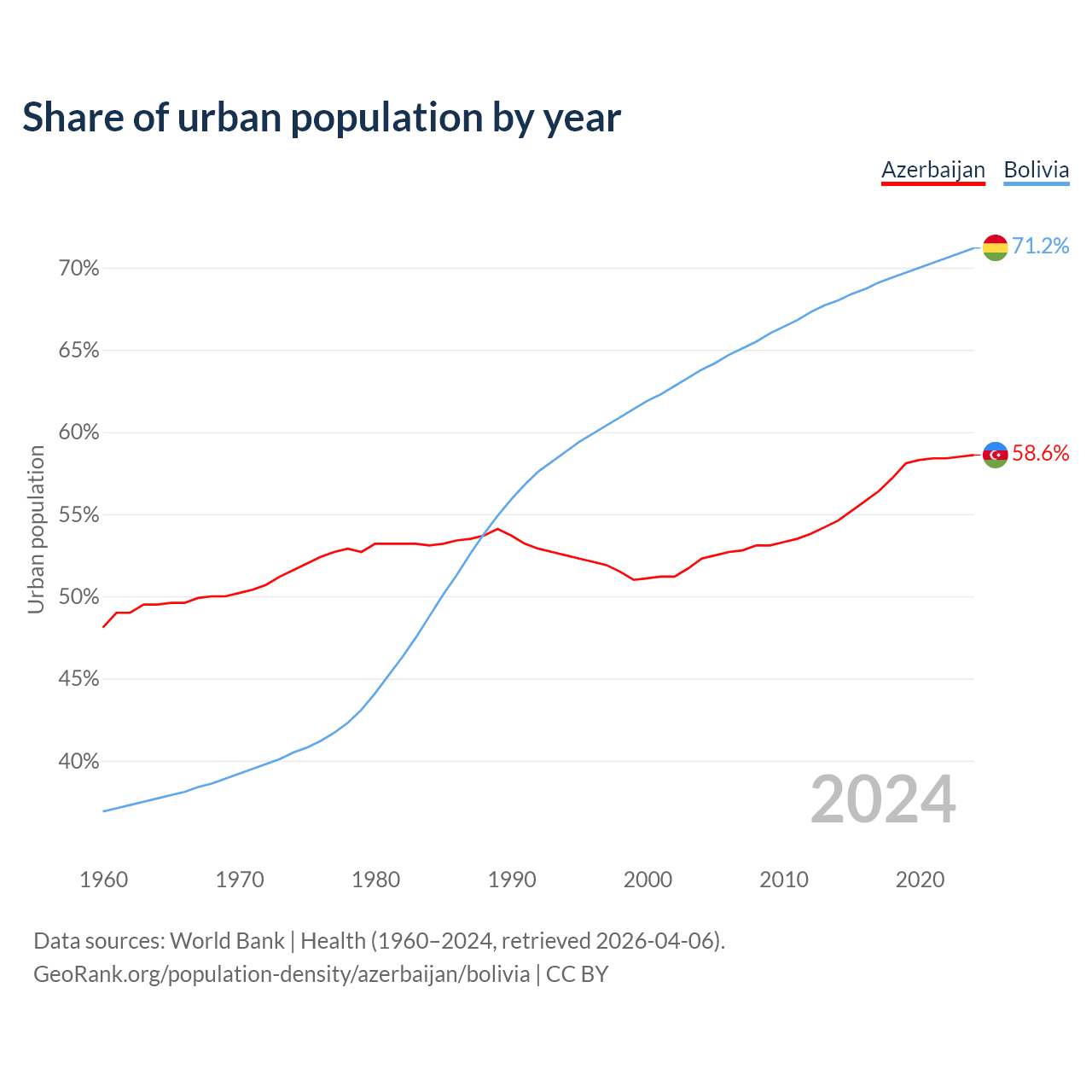 From 2004 to 2024, the share of urban population changed from 52.3% to 58.6% in Azerbaijan and from 63.8% to 71.2% in Bolivia.