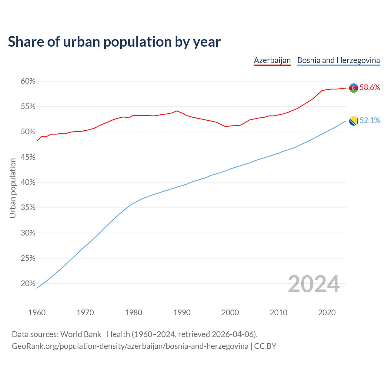 From 2006 to 2026, population density in Azerbaijan increased by 21.7%, compared to a 23.3% decline in Bosnia and Herzegovina.