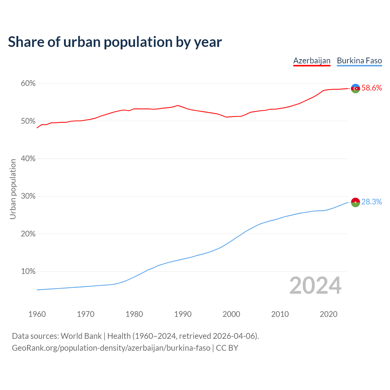 From 2004 to 2024, the share of urban population changed from 52.3% to 58.6% in Azerbaijan and from 21.3% to 28.3% in Burkina Faso.