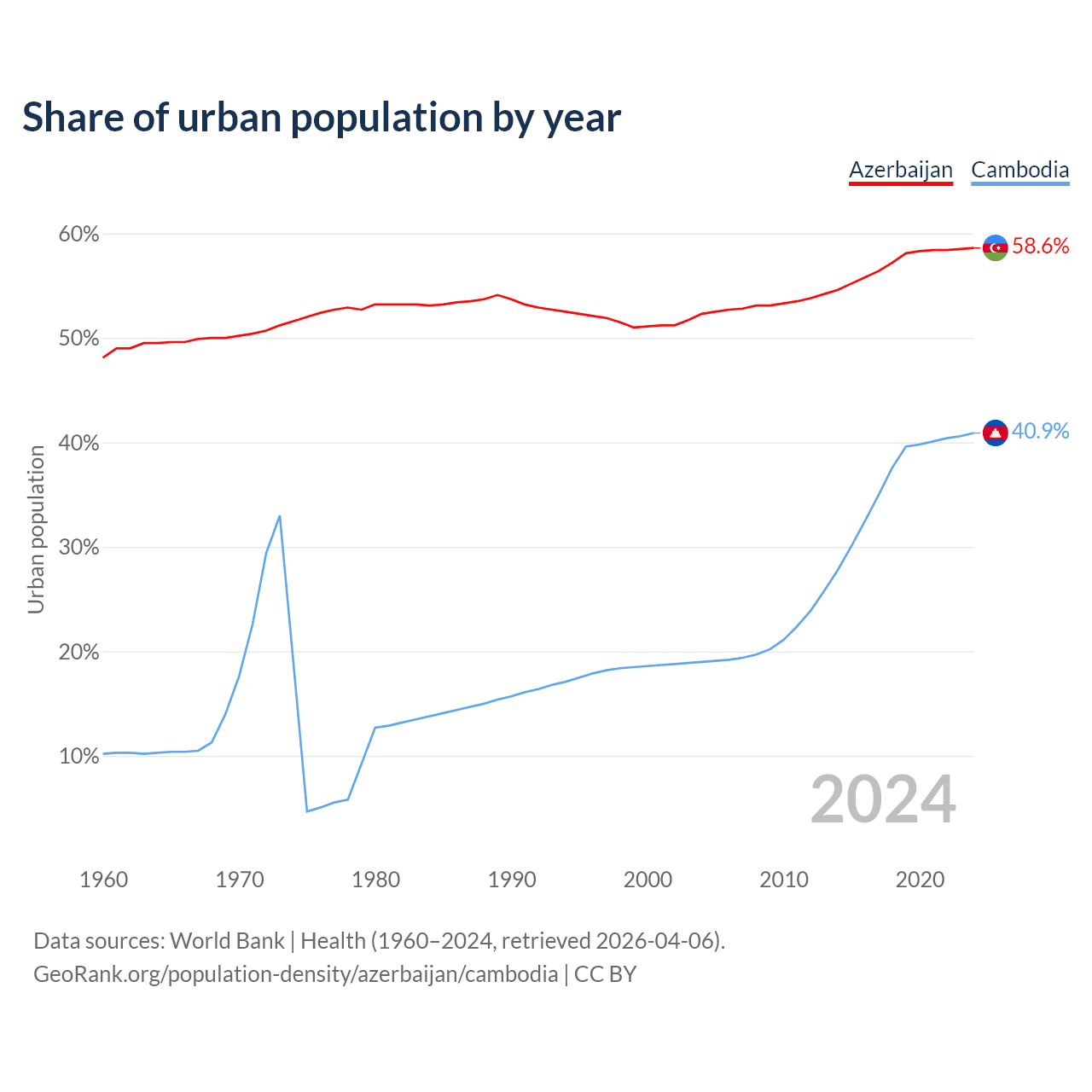 From 2004 to 2024, the share of urban population changed from 52.3% to 58.6% in Azerbaijan and from 19% to 40.9% in Cambodia.