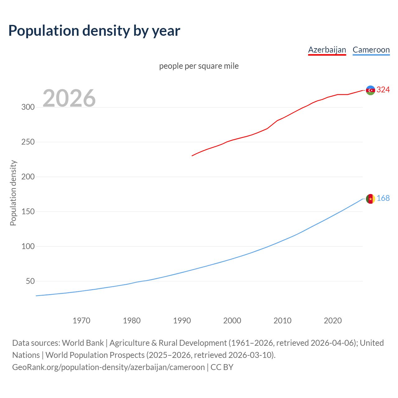 Azerbaijan has a population density of 324 people per square mile compared to 168 people in Cameroon. Azerbaijan has 91,362 sq ft of land per person vs 175,720 sq ft in Cameroon. Azerbaijan and Cameroon rank 76th and 126th by population density, respectively.